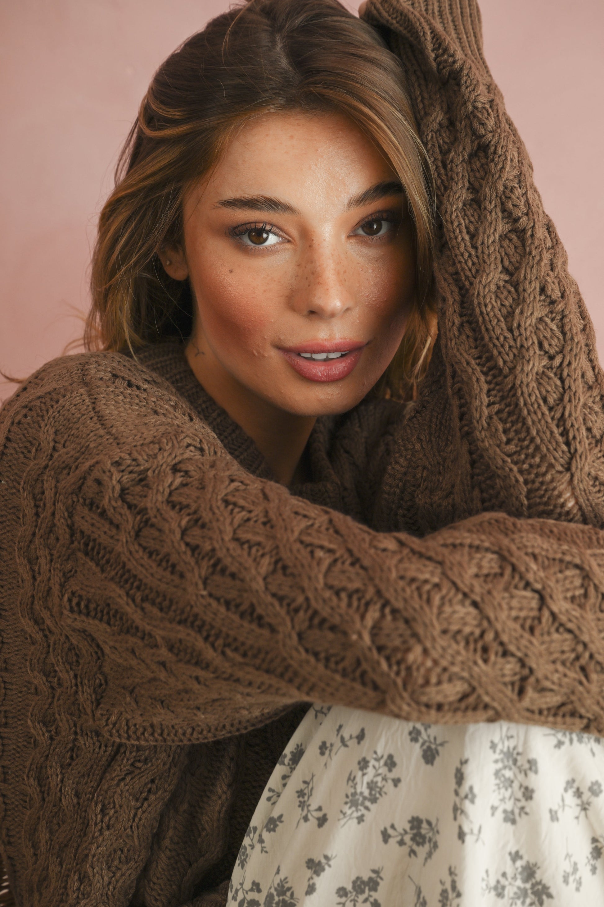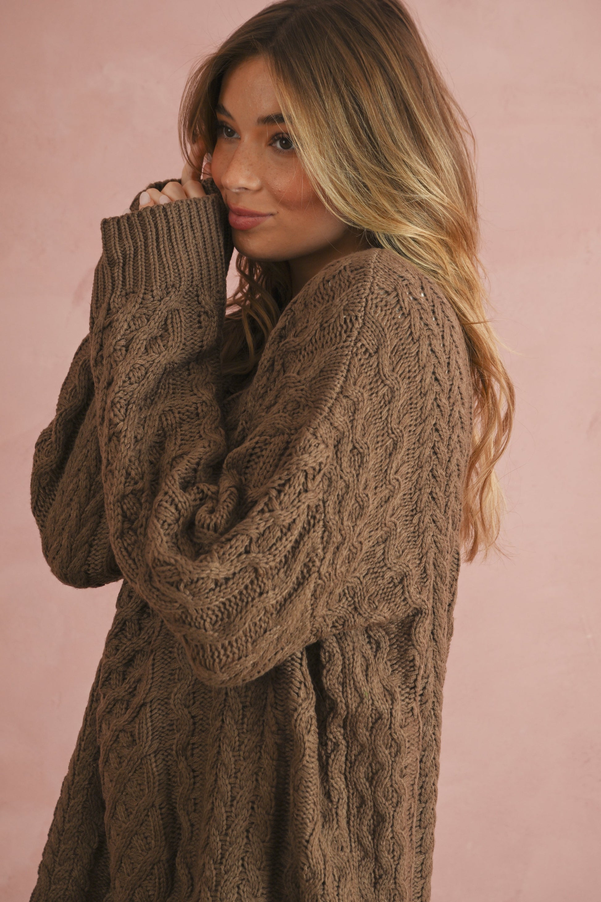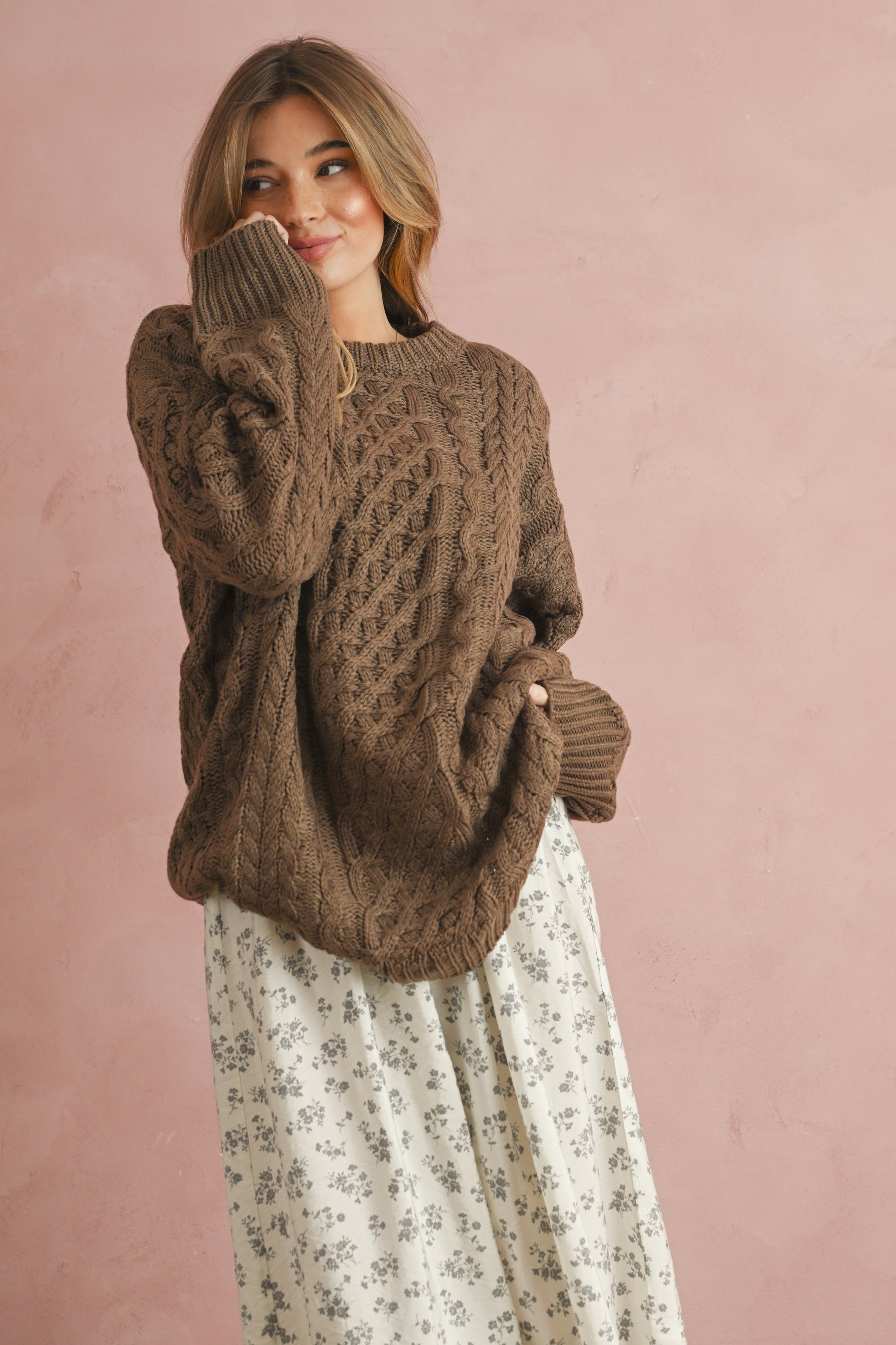 This cozy sweater features an oversized fit, intricate cable knit details, and a ribbed hem for added style and comfort.