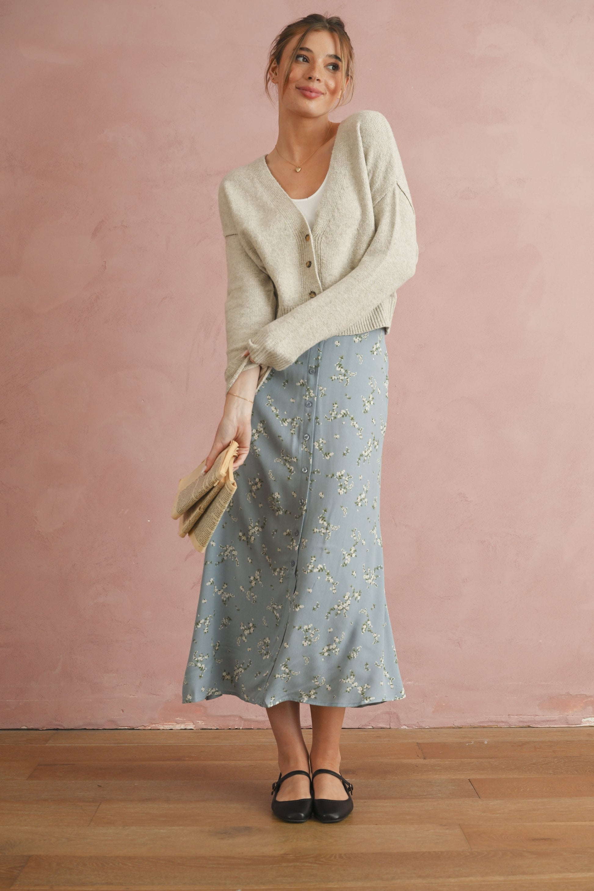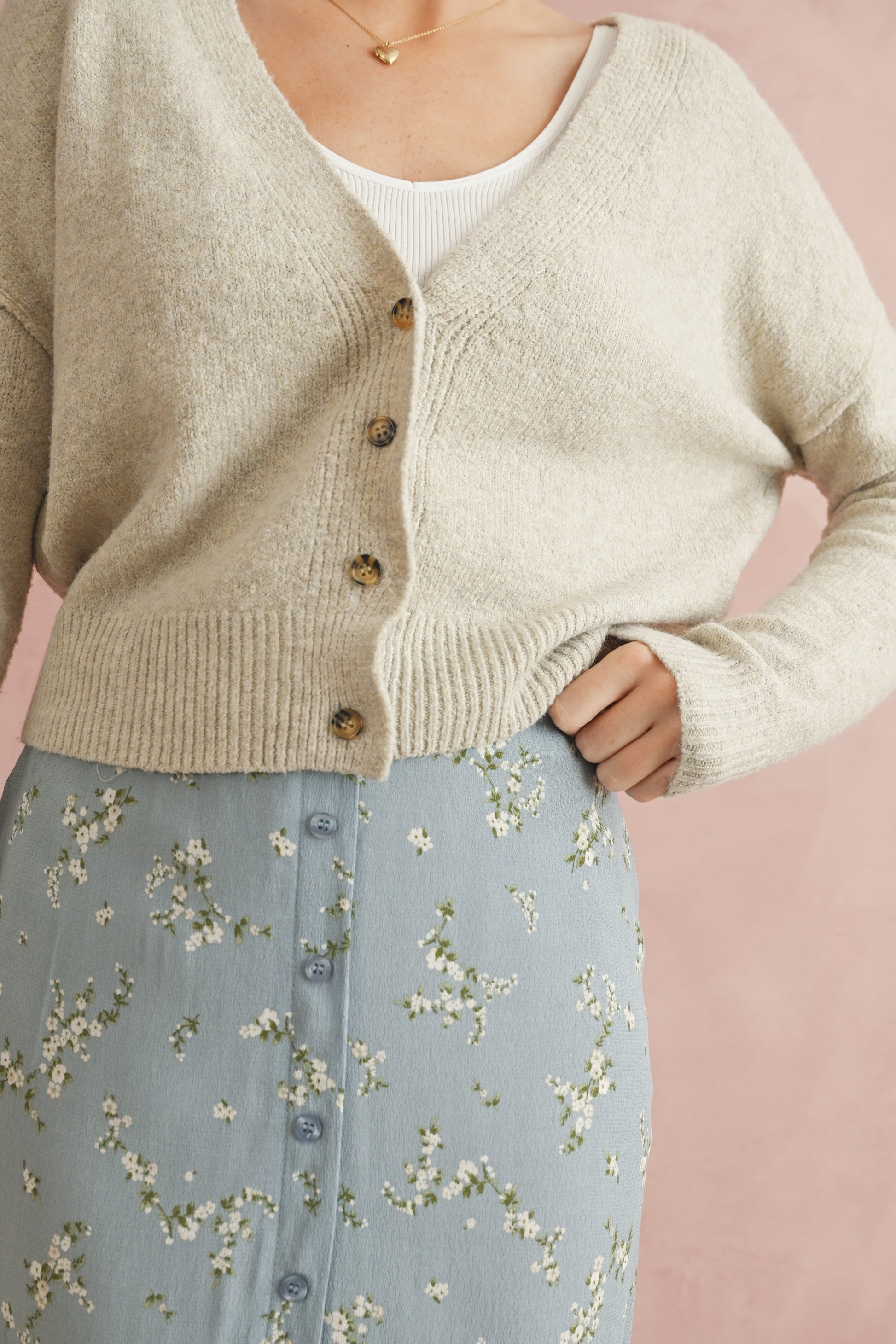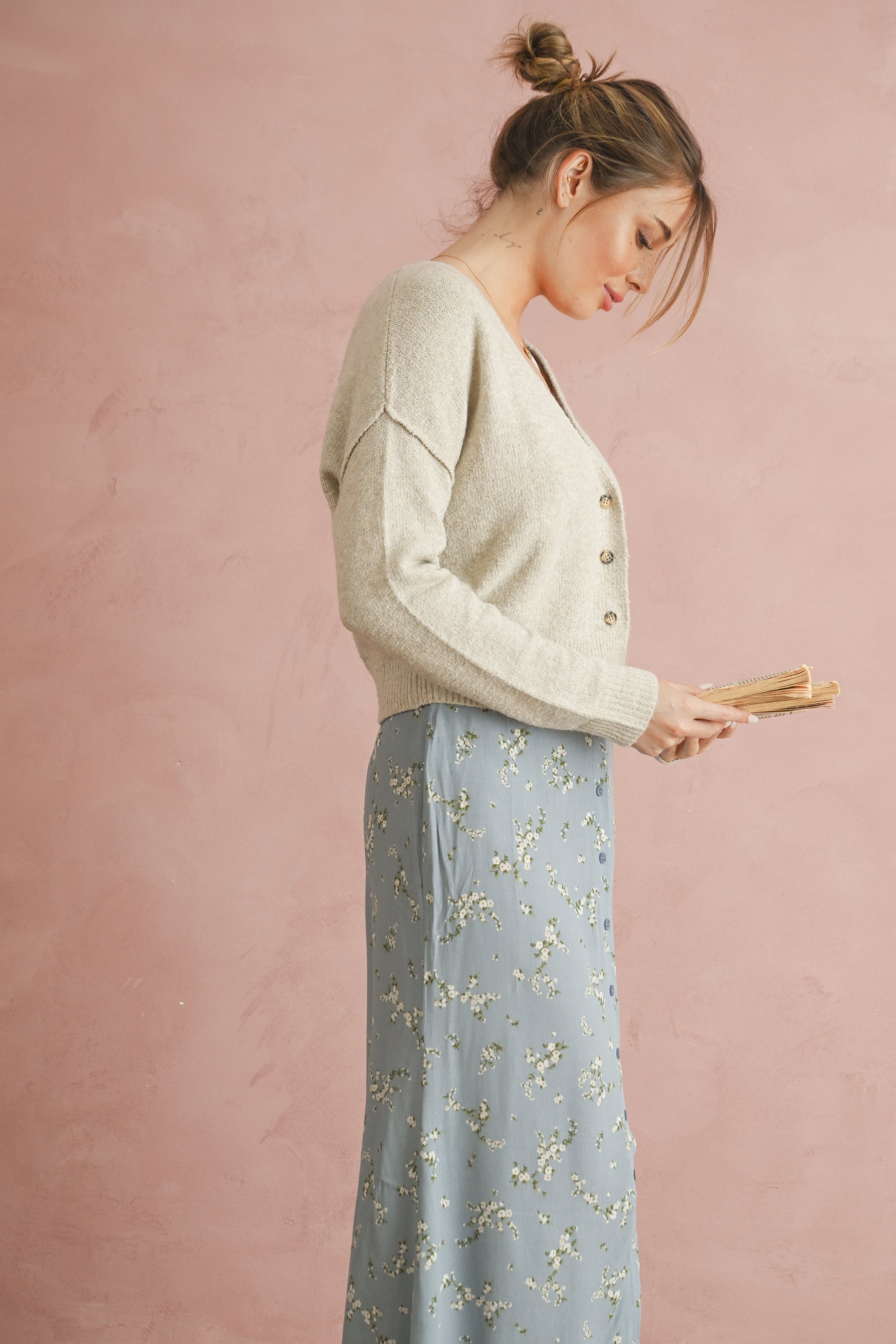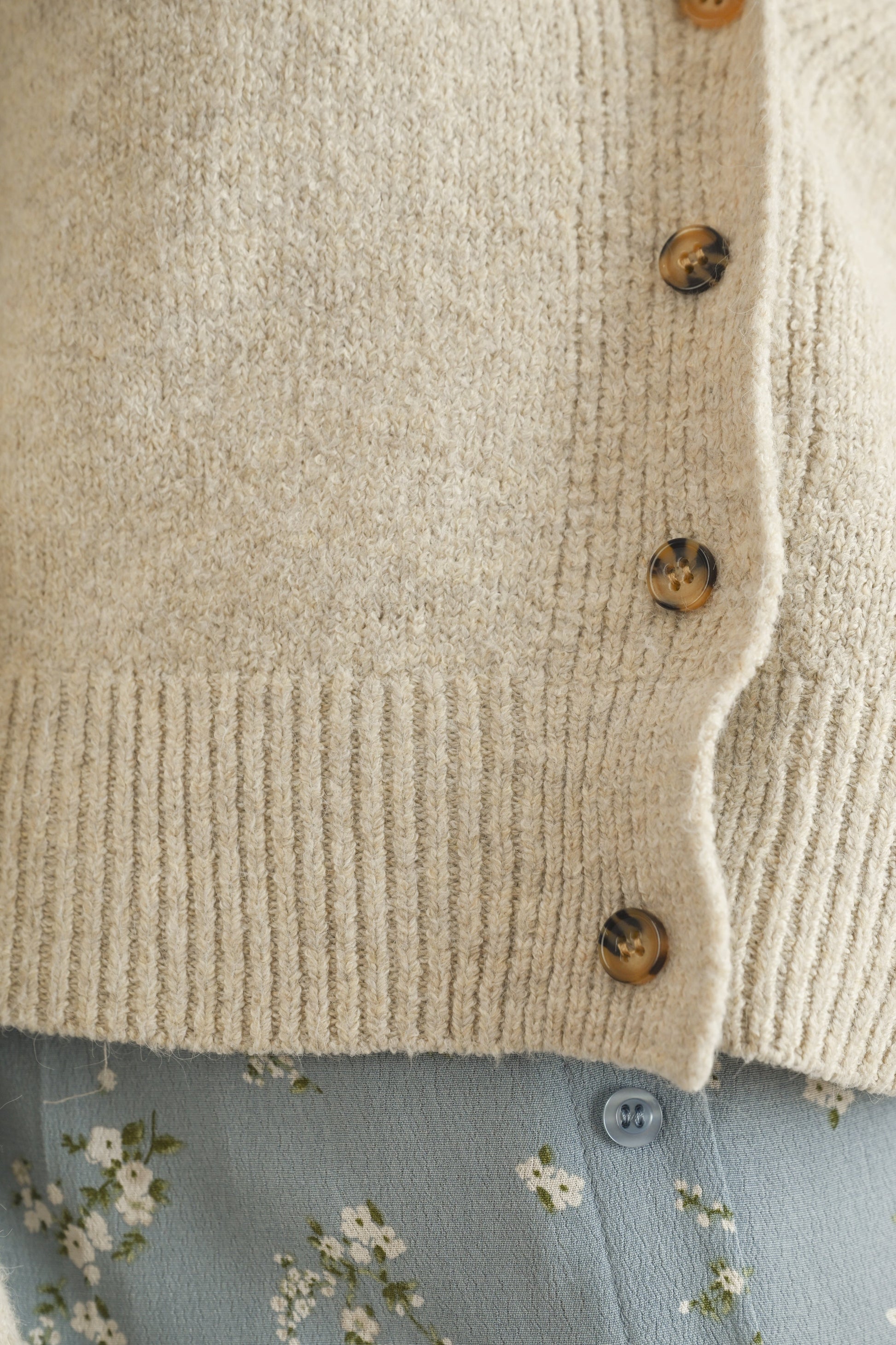 Cardigan features tortoise buttons along front, ribbed hemming detailing, and drop shoulders.