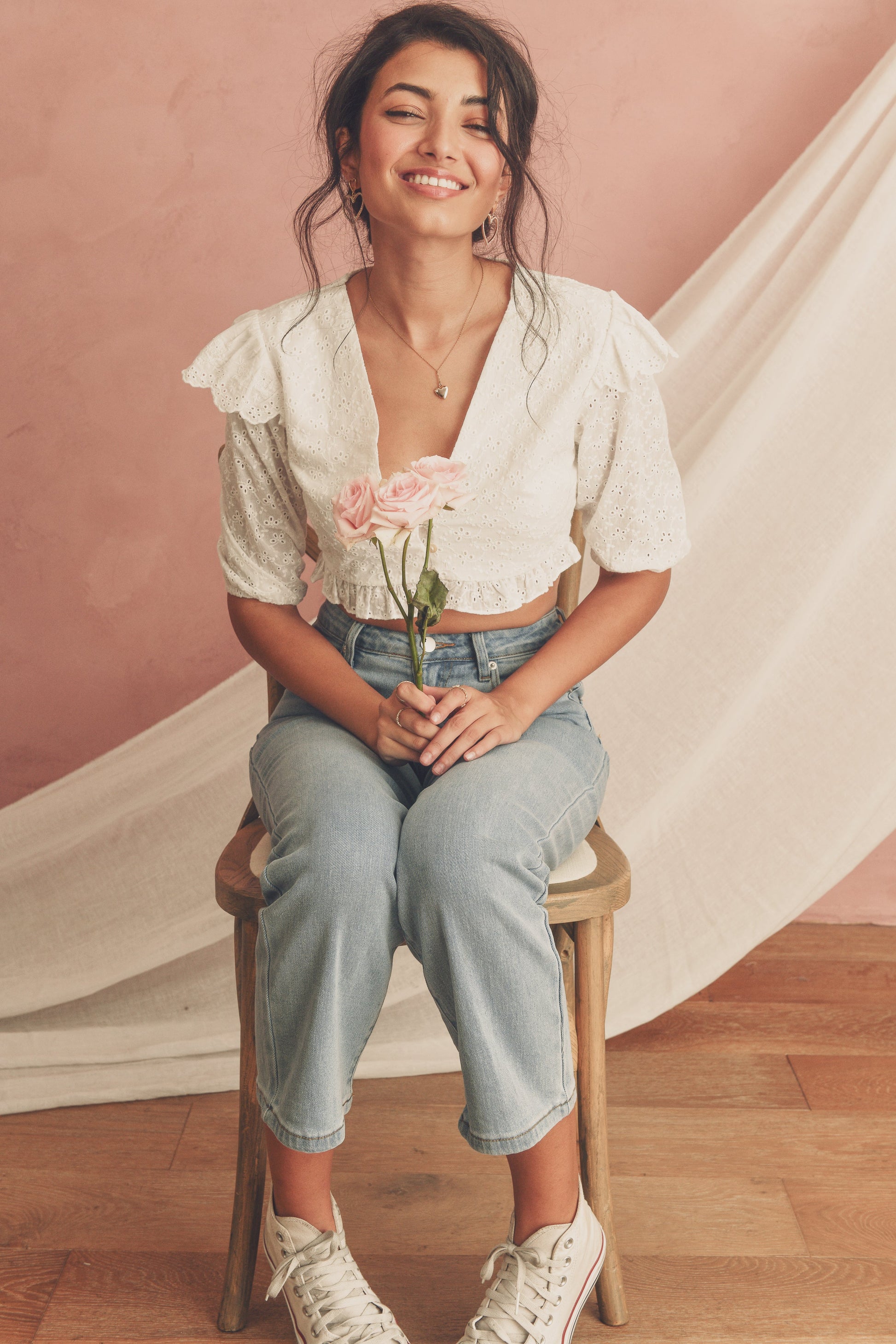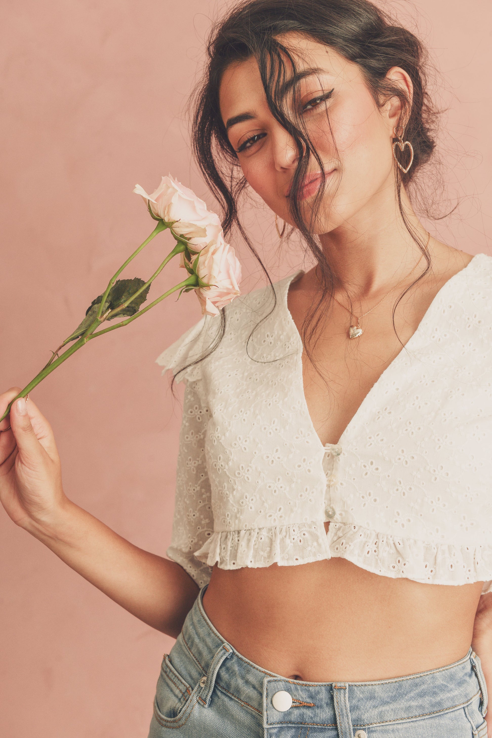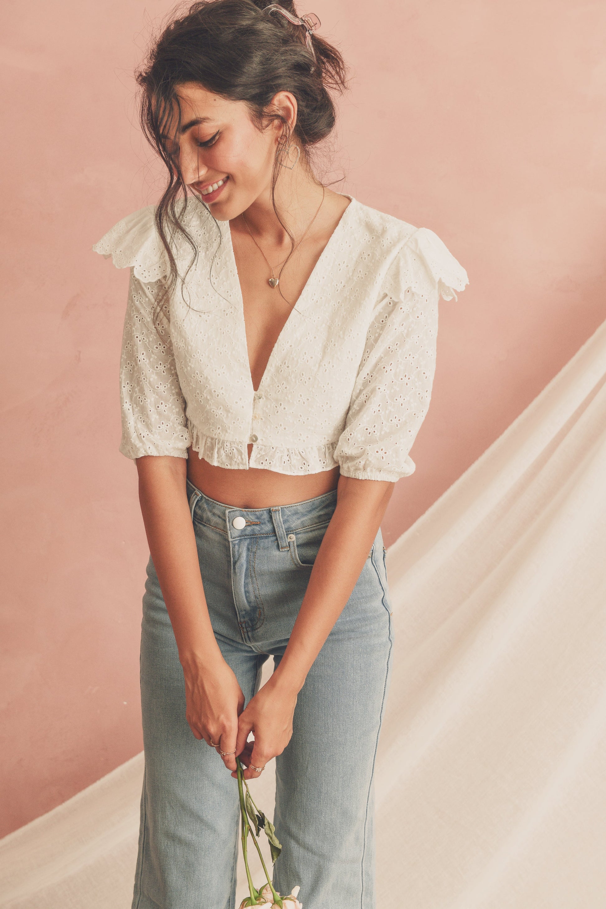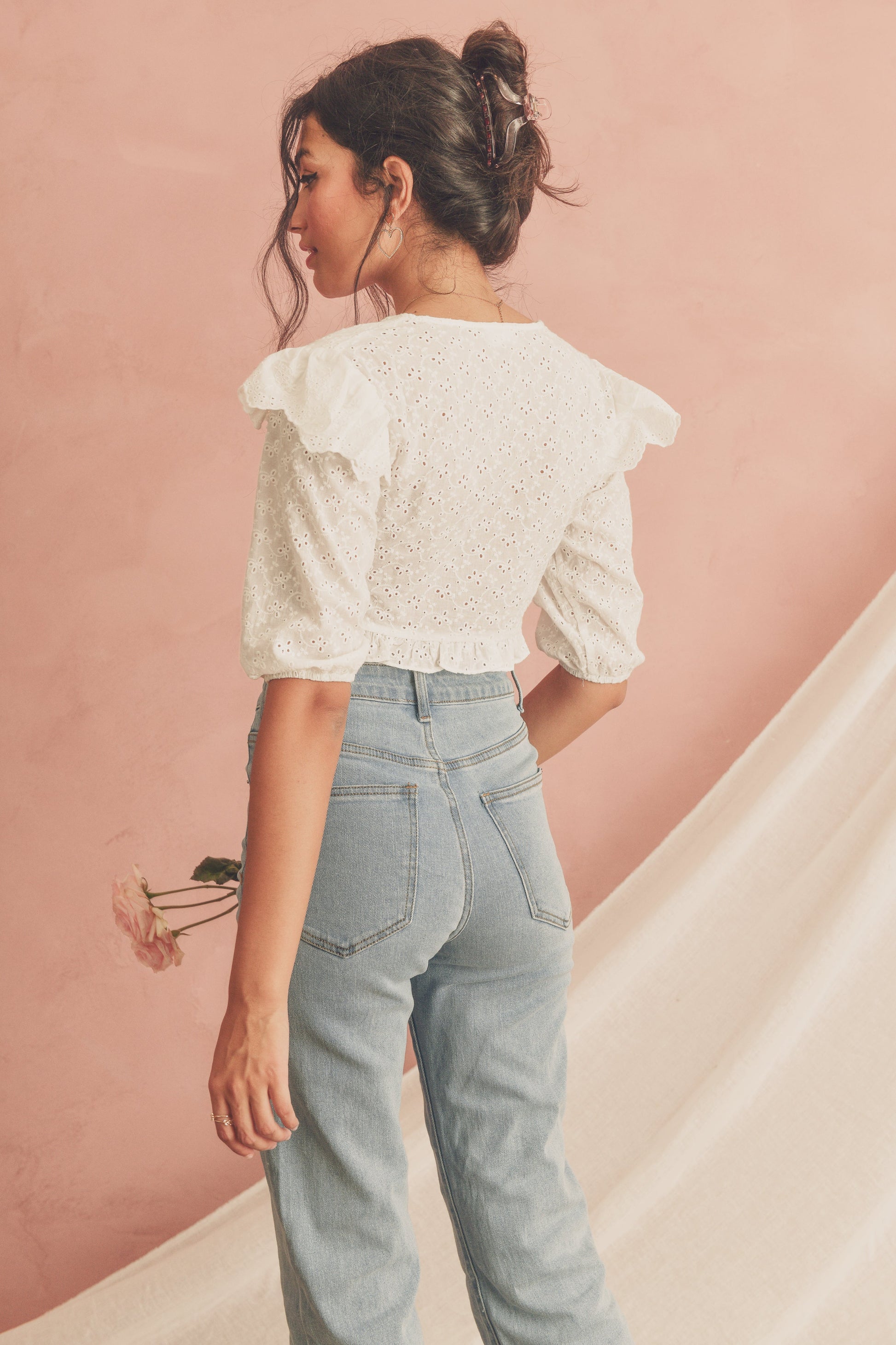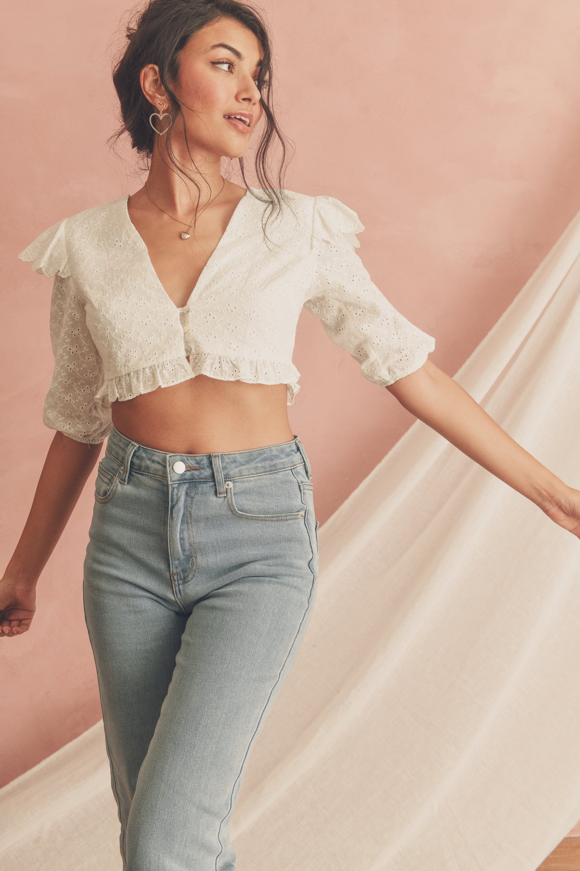 White eyelet top features, cropped fit, v-neckline, quarter sleeves with elastic cuffs, three shell buttons, and front lined. Paired with sea becomes sky pants.
