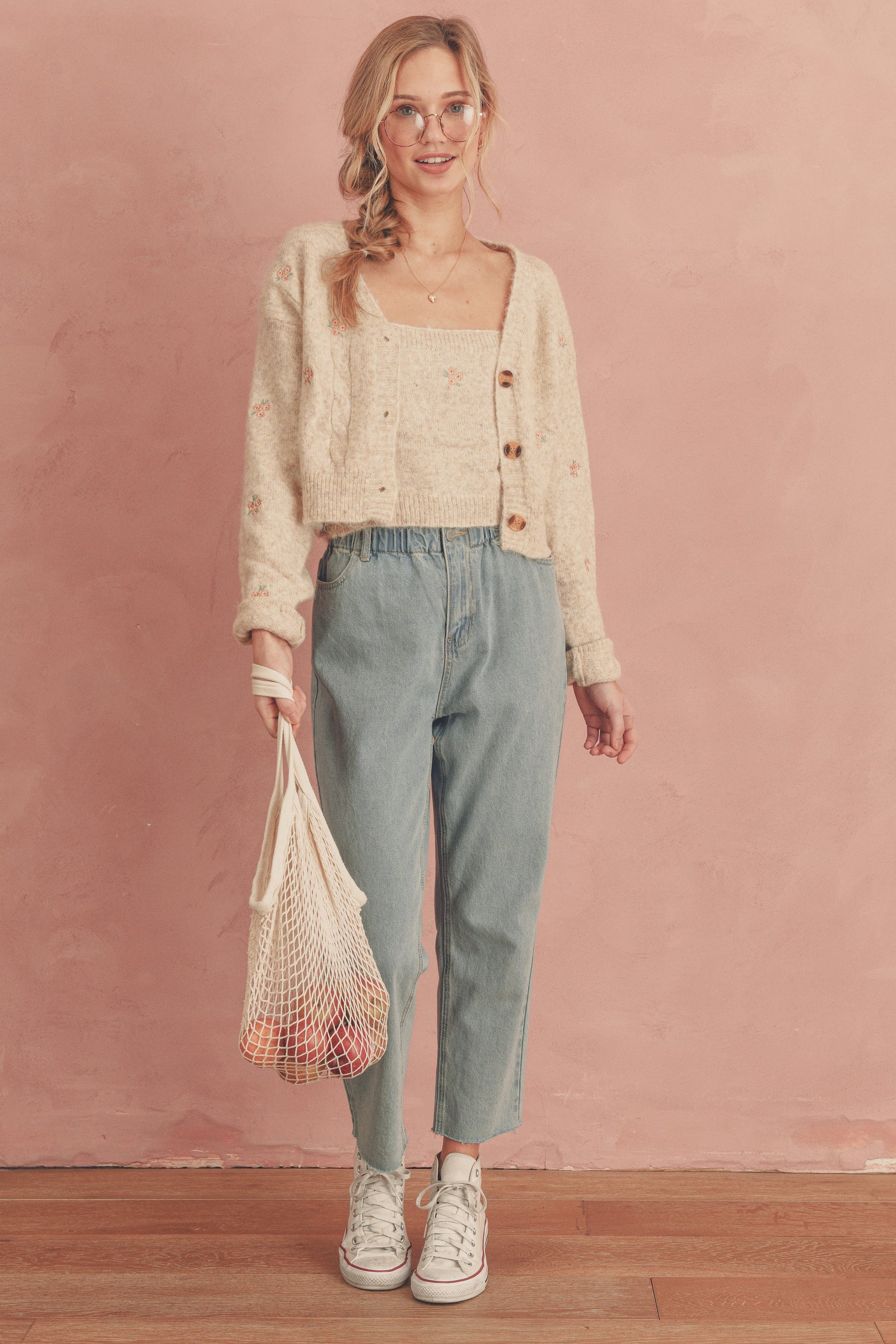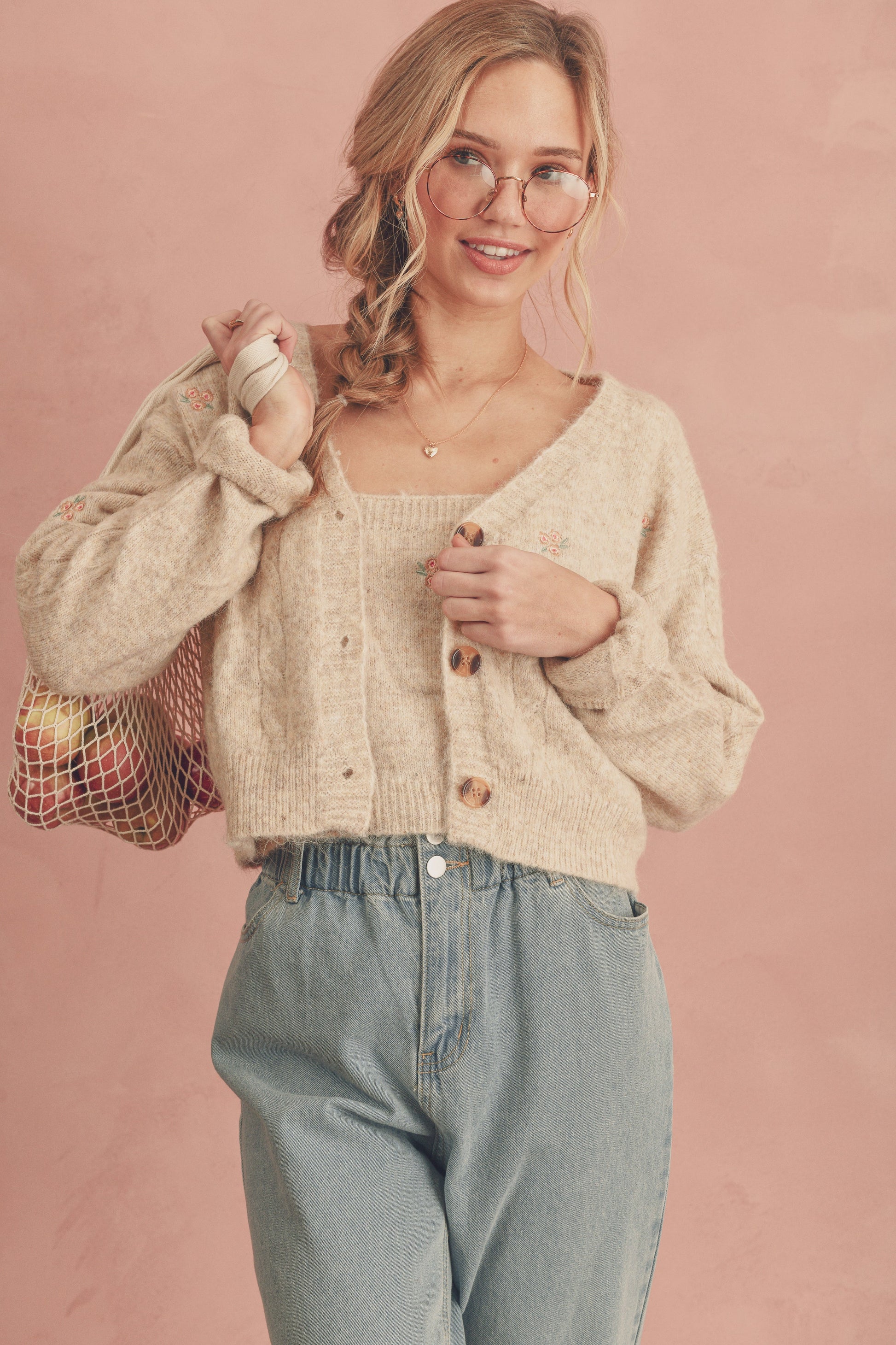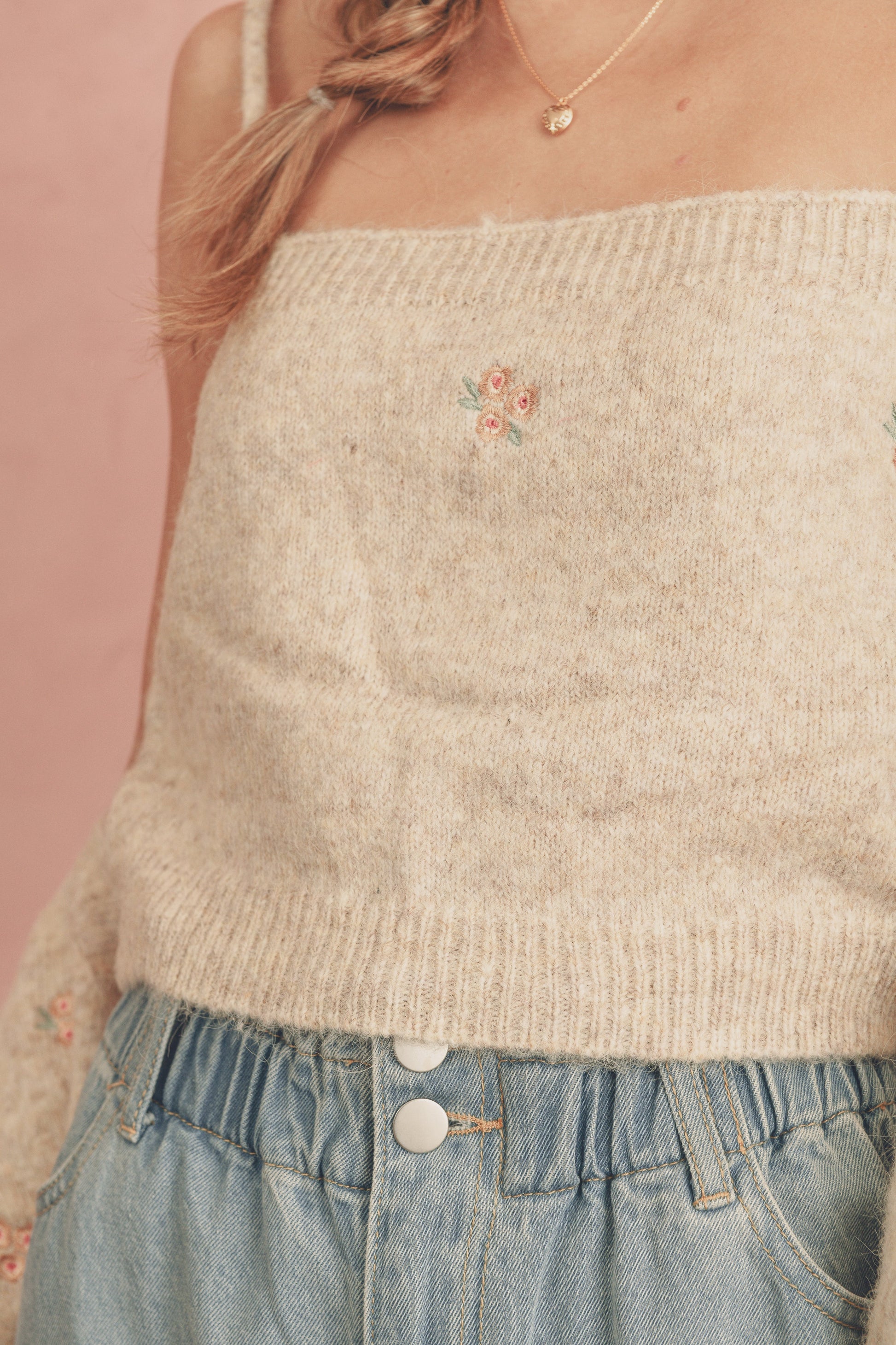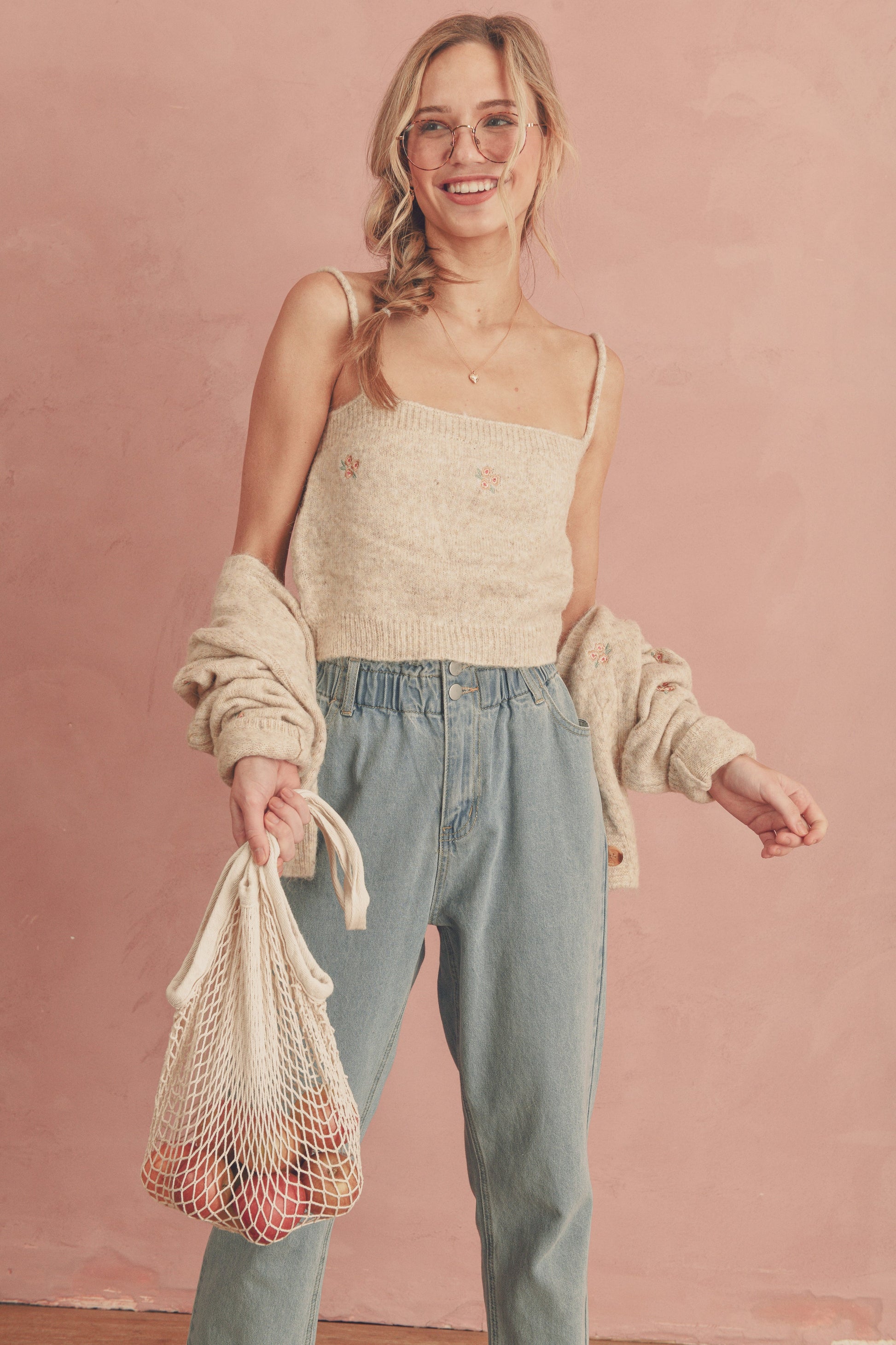 Sold as a set. Cardigan features embroidered floral design throughout, and tortoise shell buttons. Top features ribbed hemming detail and thin straps. Paired with golden heart locket, flutter ring, Dorthy earrings, and you know me best pants.