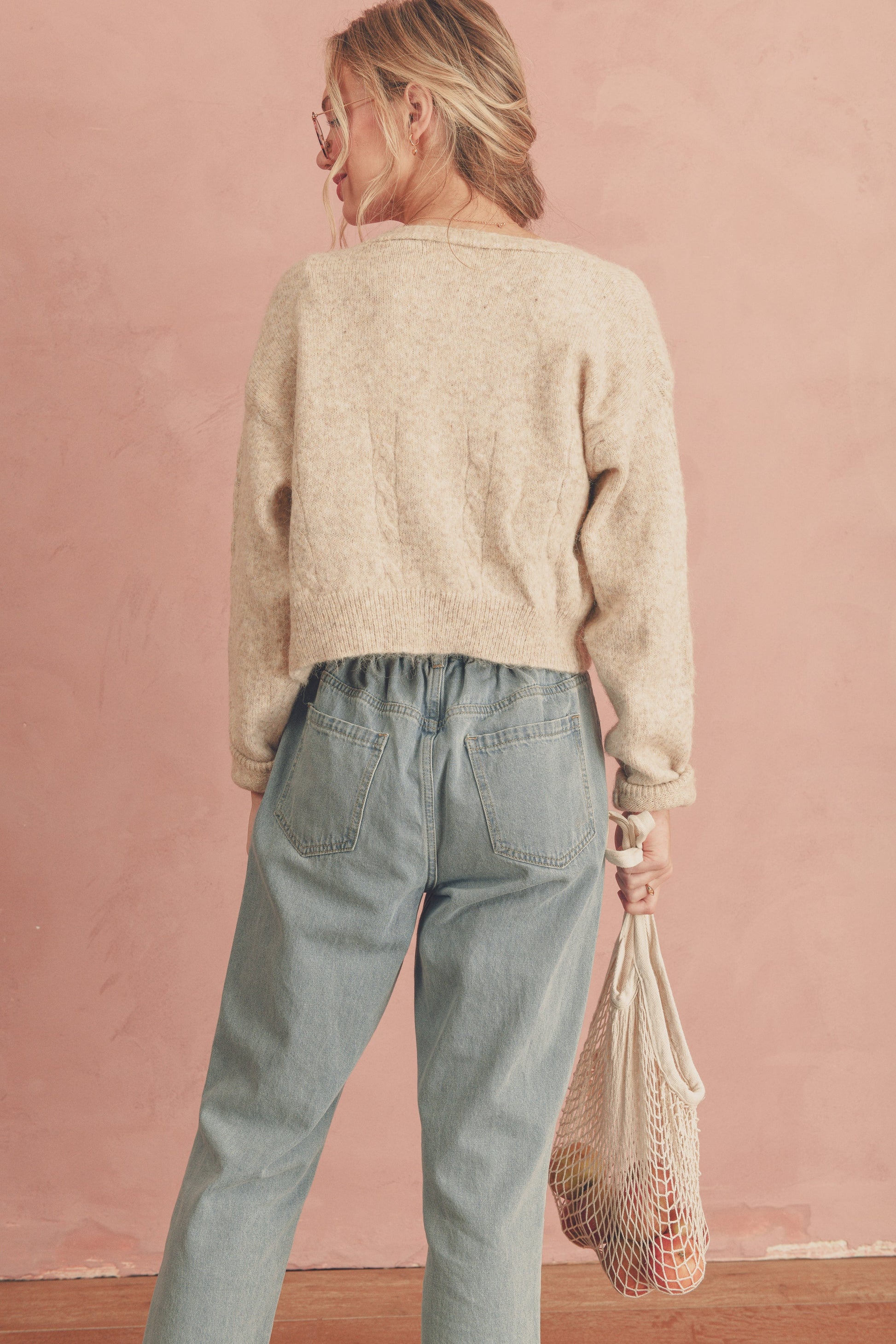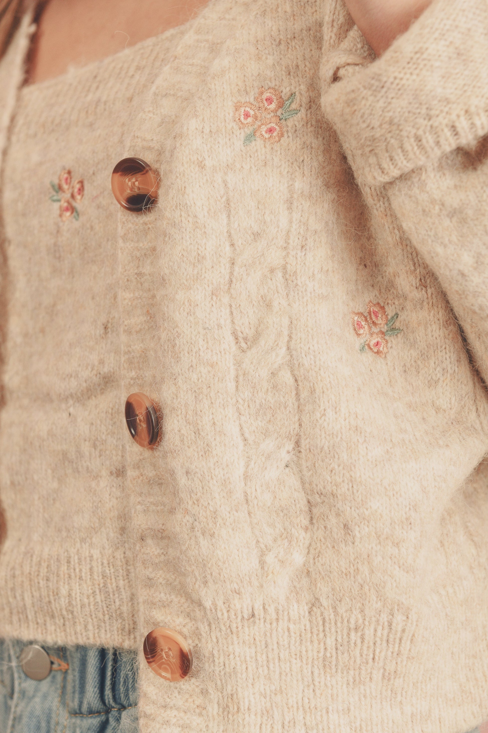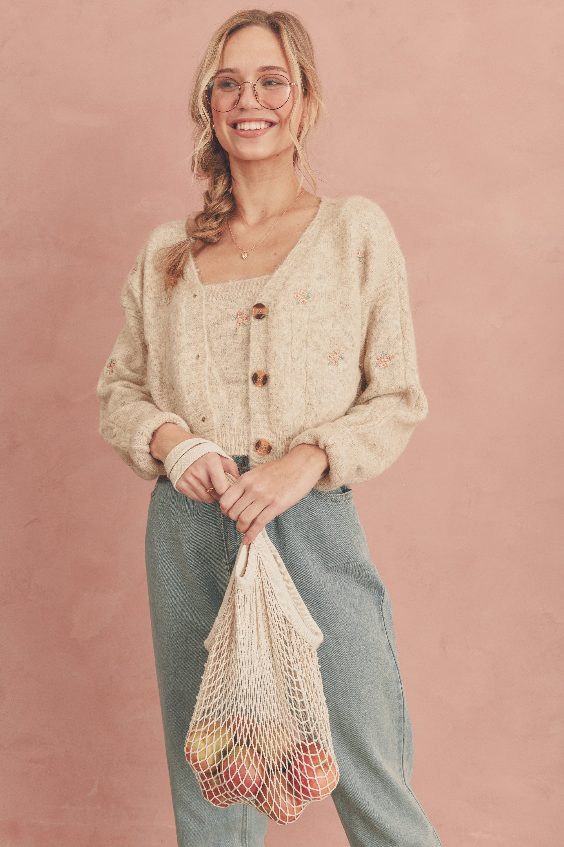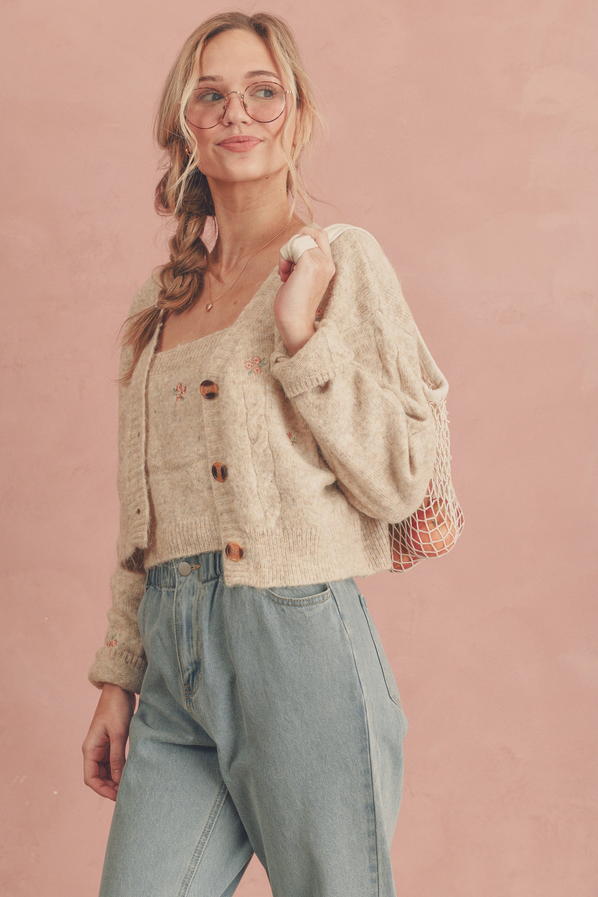 Sold as a set. Cardigan features embroidered floral design throughout, and tortoise shell buttons. Top features ribbed hemming detail and thin straps. Paired with golden heart locket, flutter ring, Dorthy earrings, and you know me best pants.