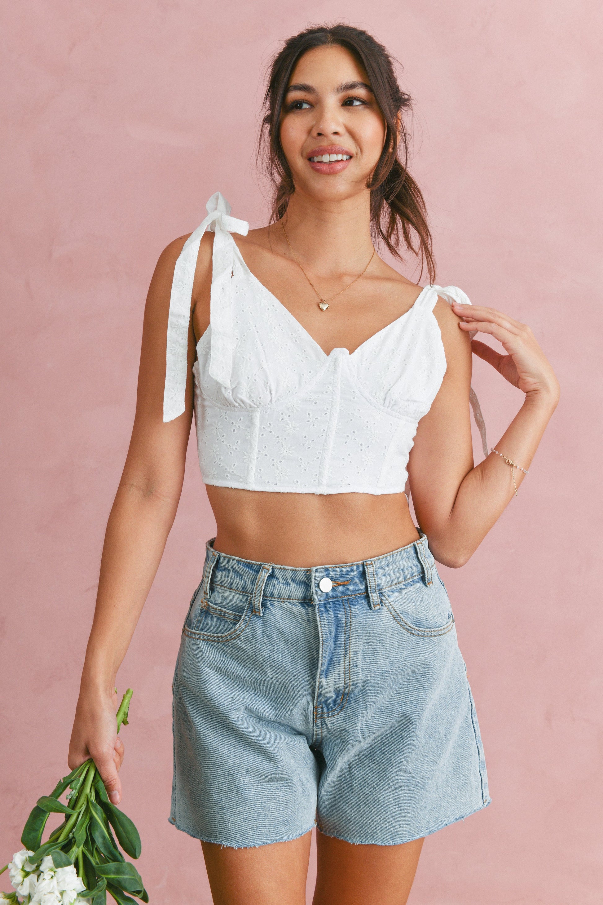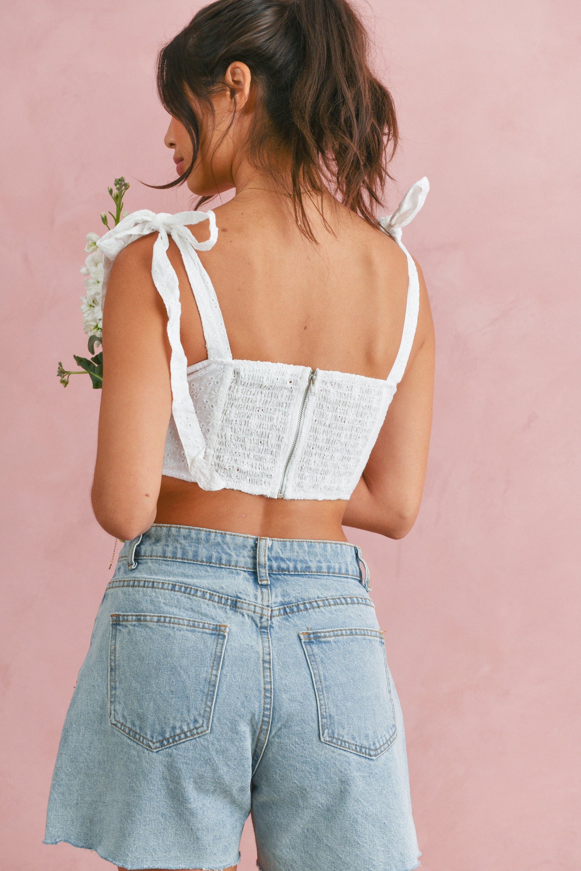 Top features v-neckline, self tie straps, eyelet fabric detailing throughout, smocked back with zipper, bodice features boning, and fully lined. Paired with our golden heart locket necklace, flourish bracelet, and seeing you is the best part shorts.