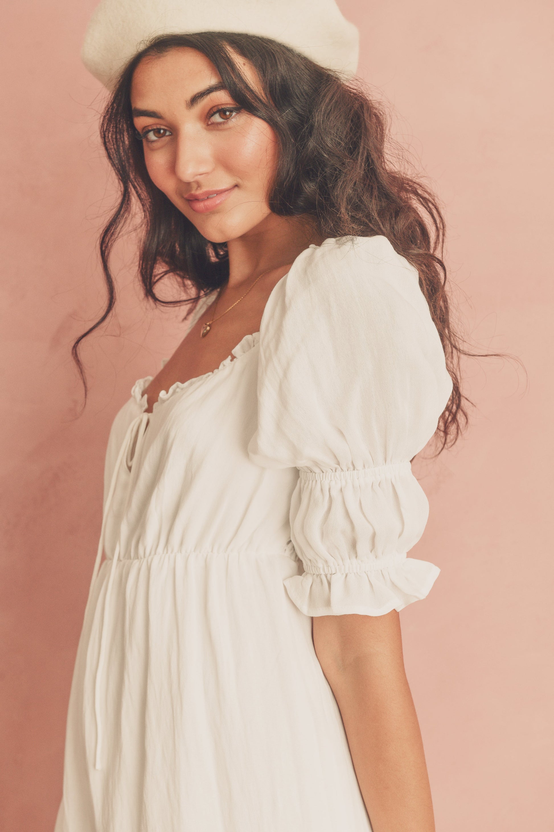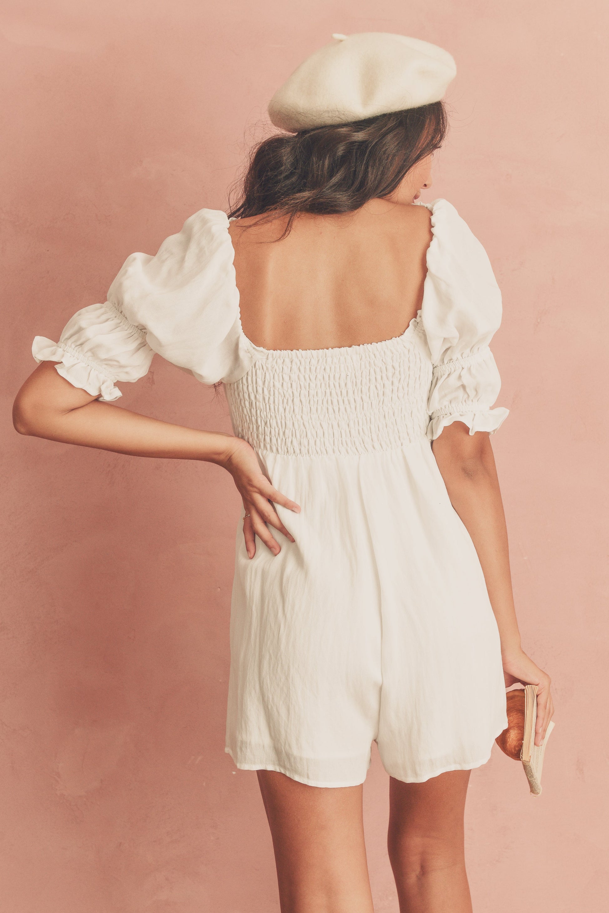 Romper features puff sleeves with elastic bands, elastic waist band, ruffle neckline, front self tie bow, smocked back, and fully lined., Paired with our poet heart locket necklace, tiny butterfly studs and white dove beret.