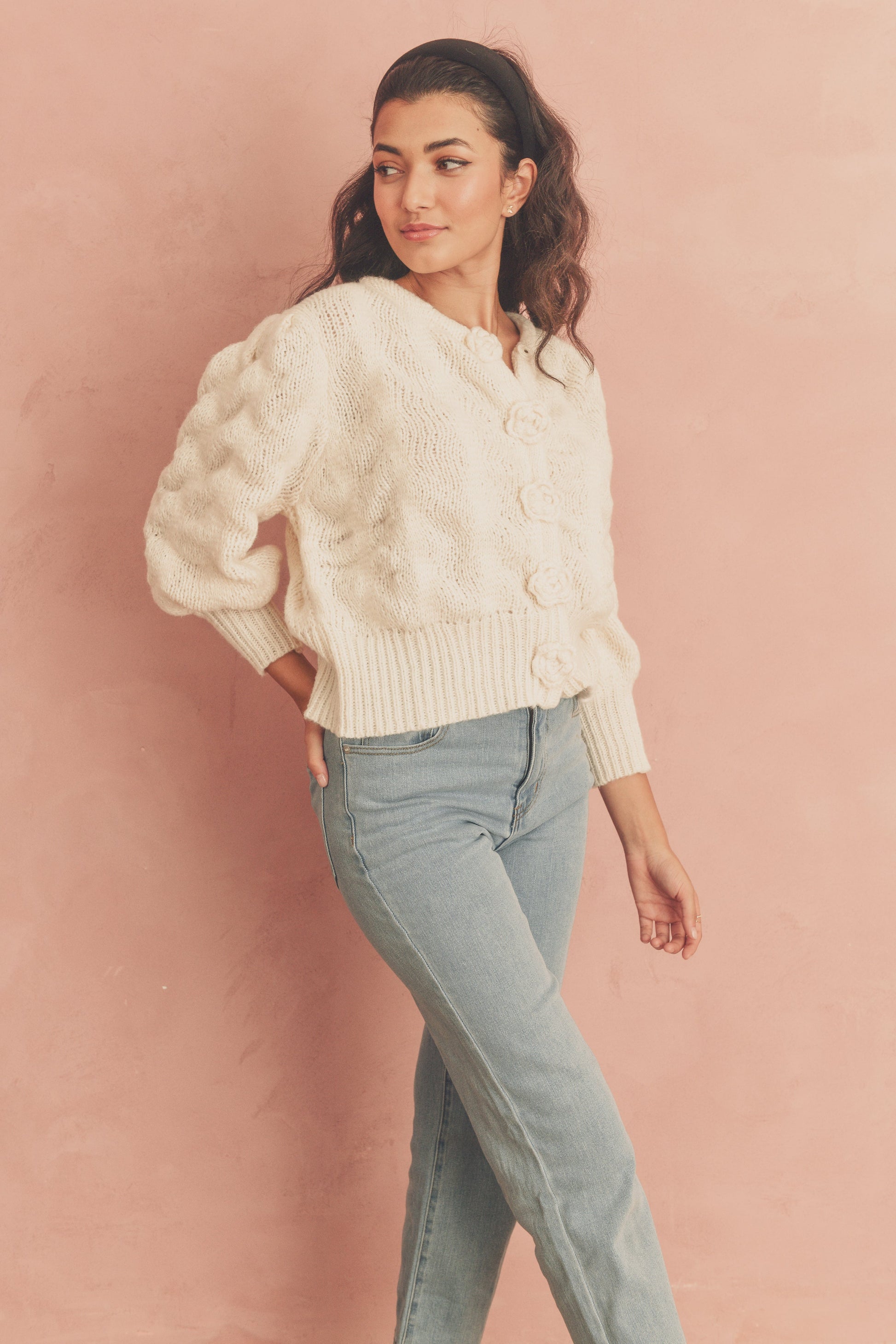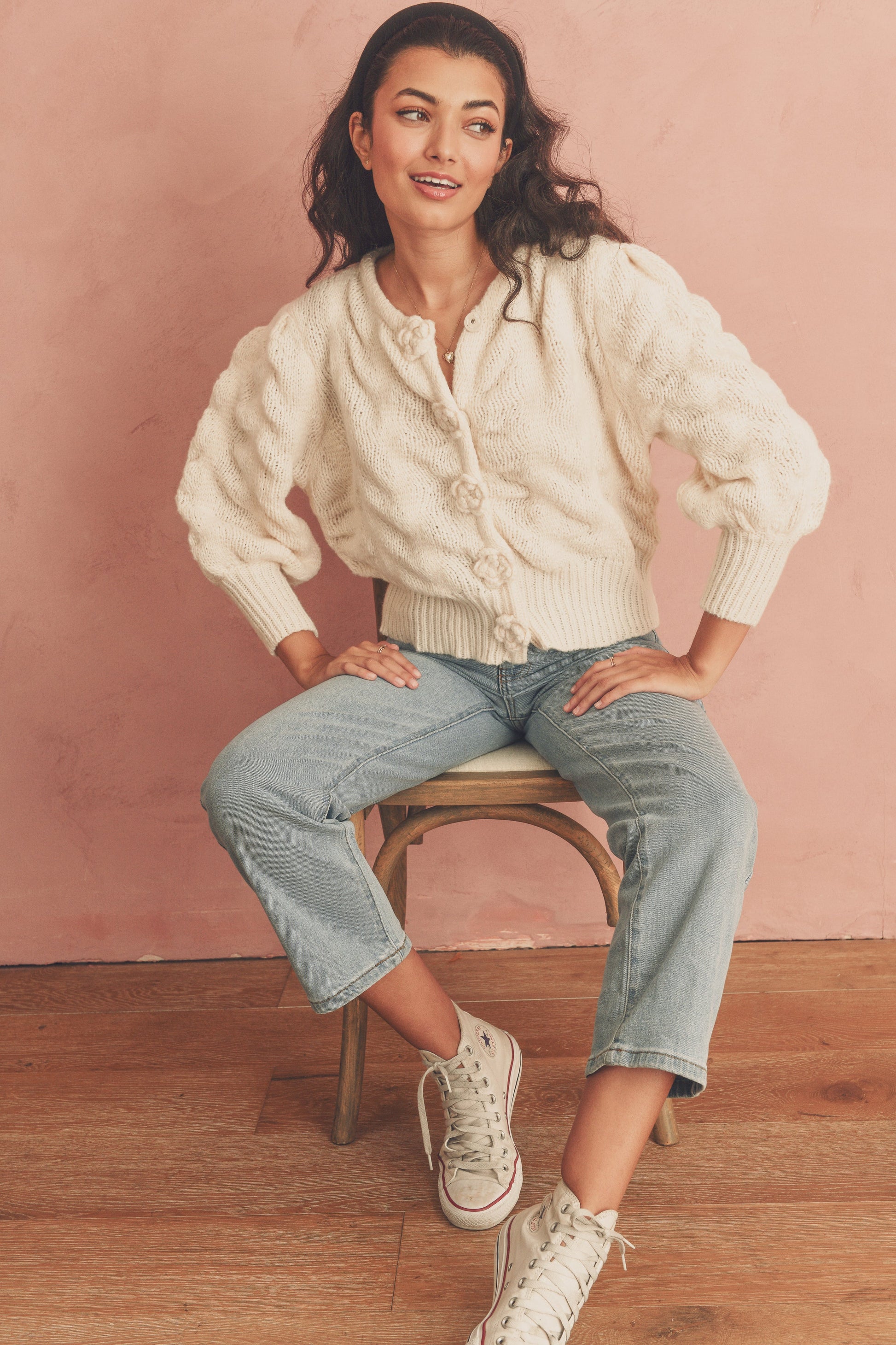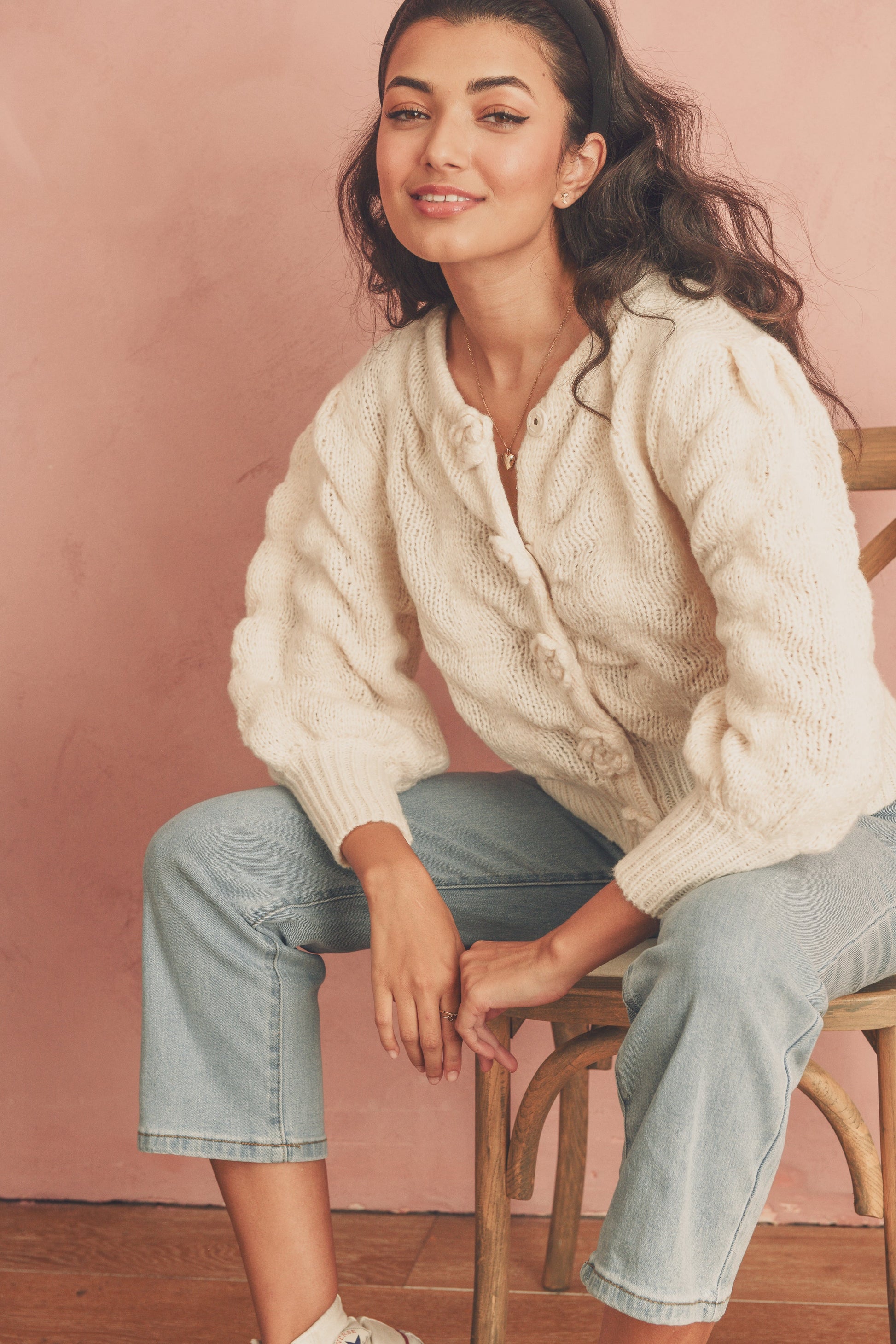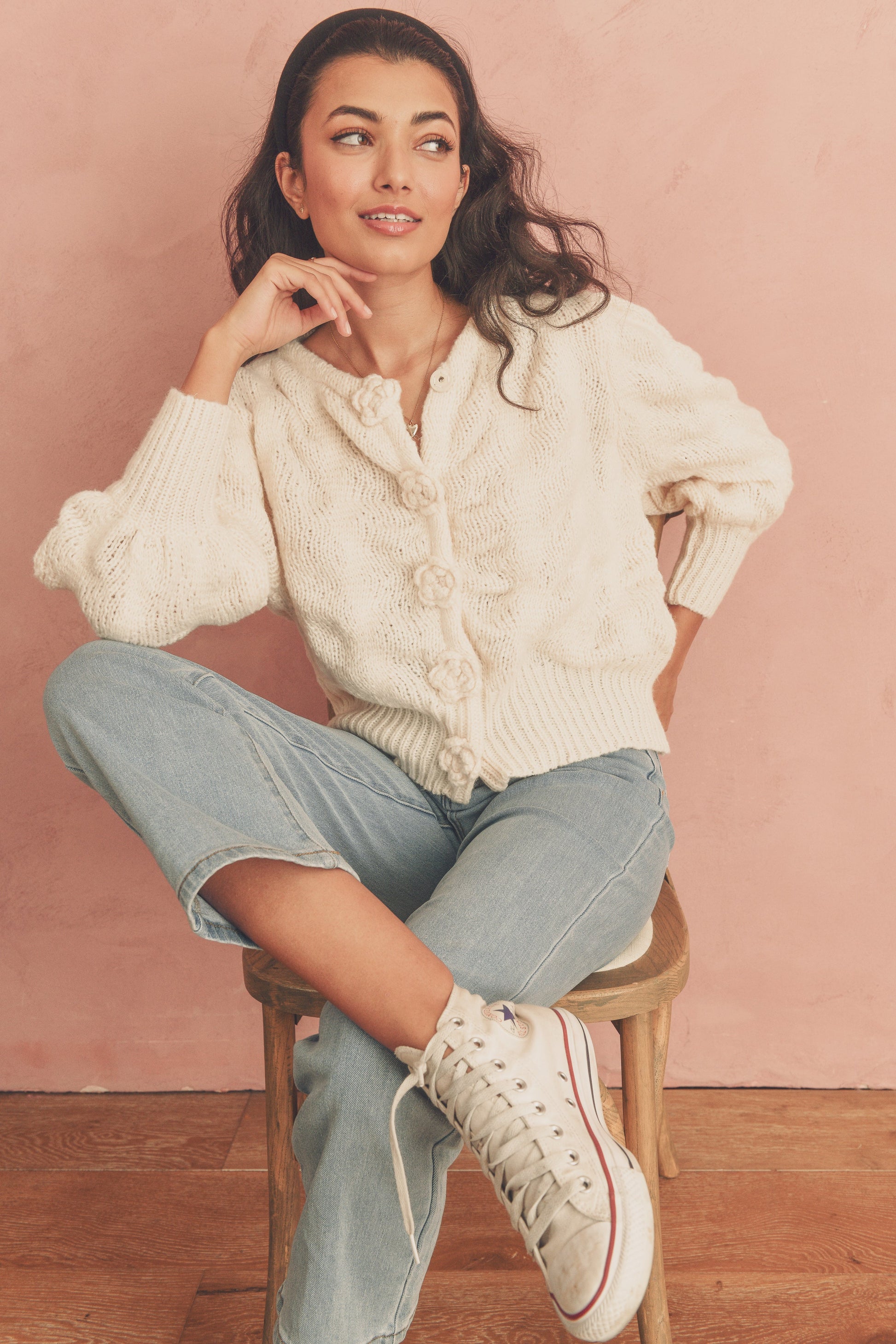 Cardigan features functional snap on buttons along front, knitted rose button detailing and ribbed hemming. Paired with autumn air headband and sea become sky pants.