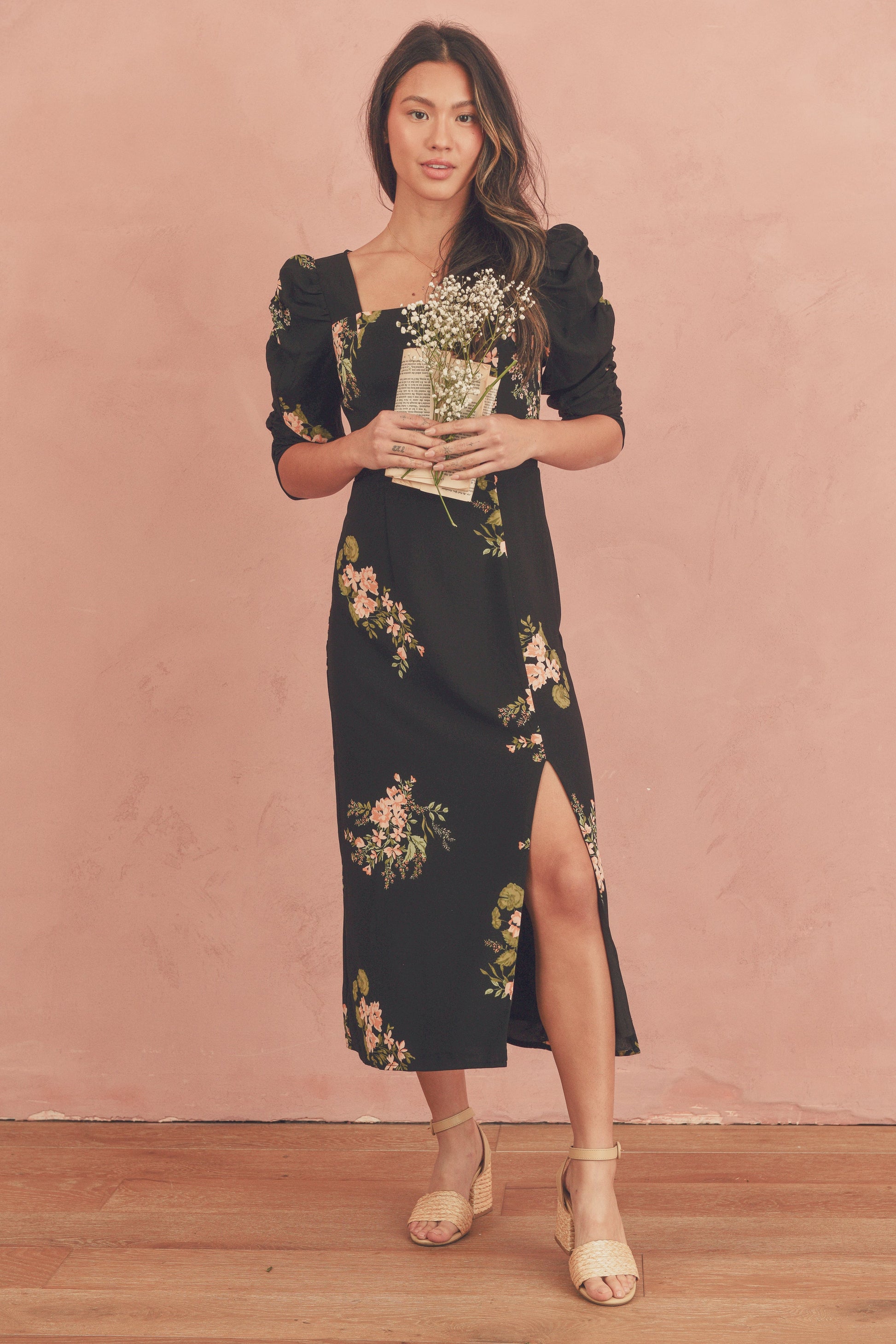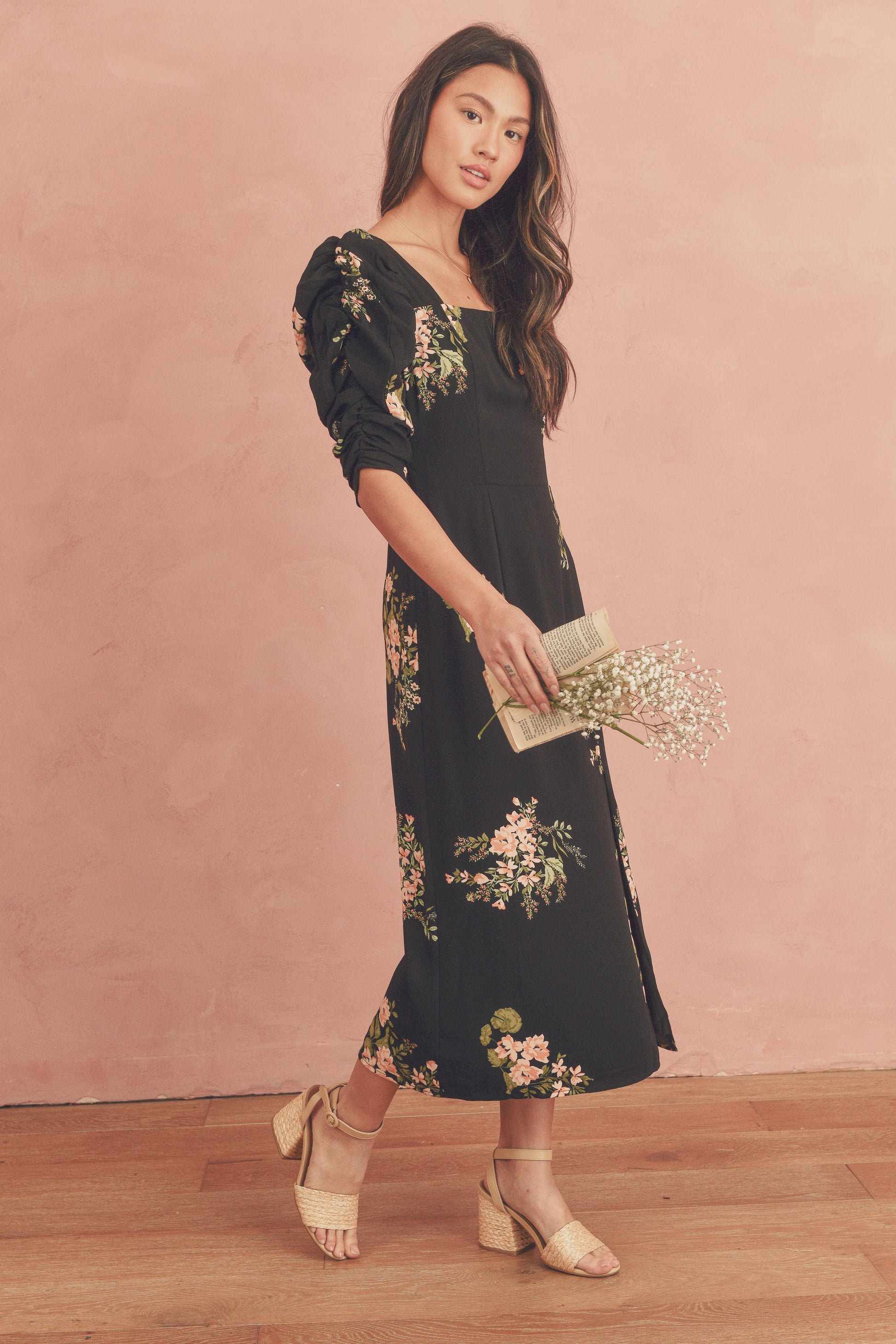 Dress features ruching elastic along arms, hidden back zipper, fully lined, and front slit. Paired with golden heart locket, tiny butterfly studs, and true romance shoes.