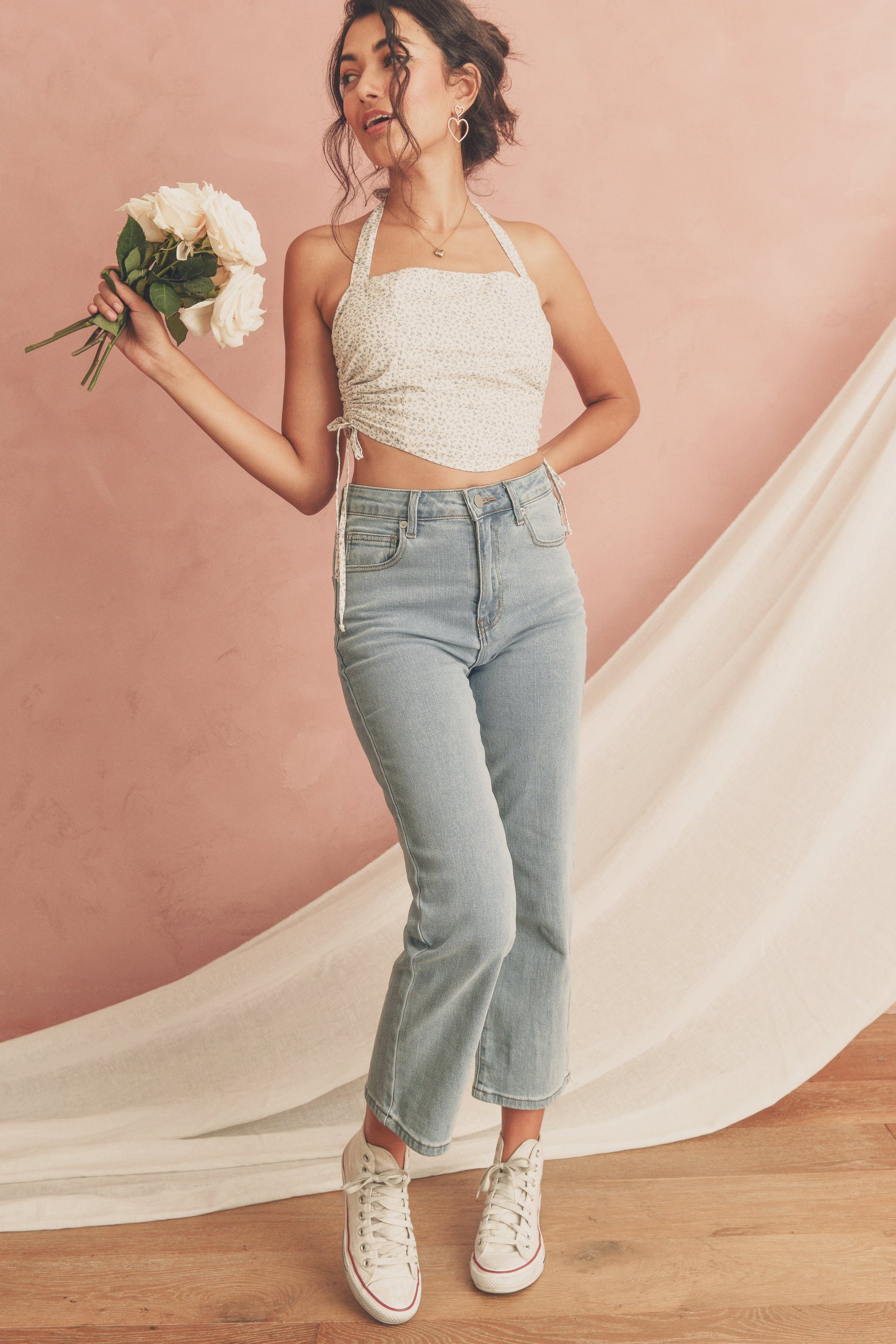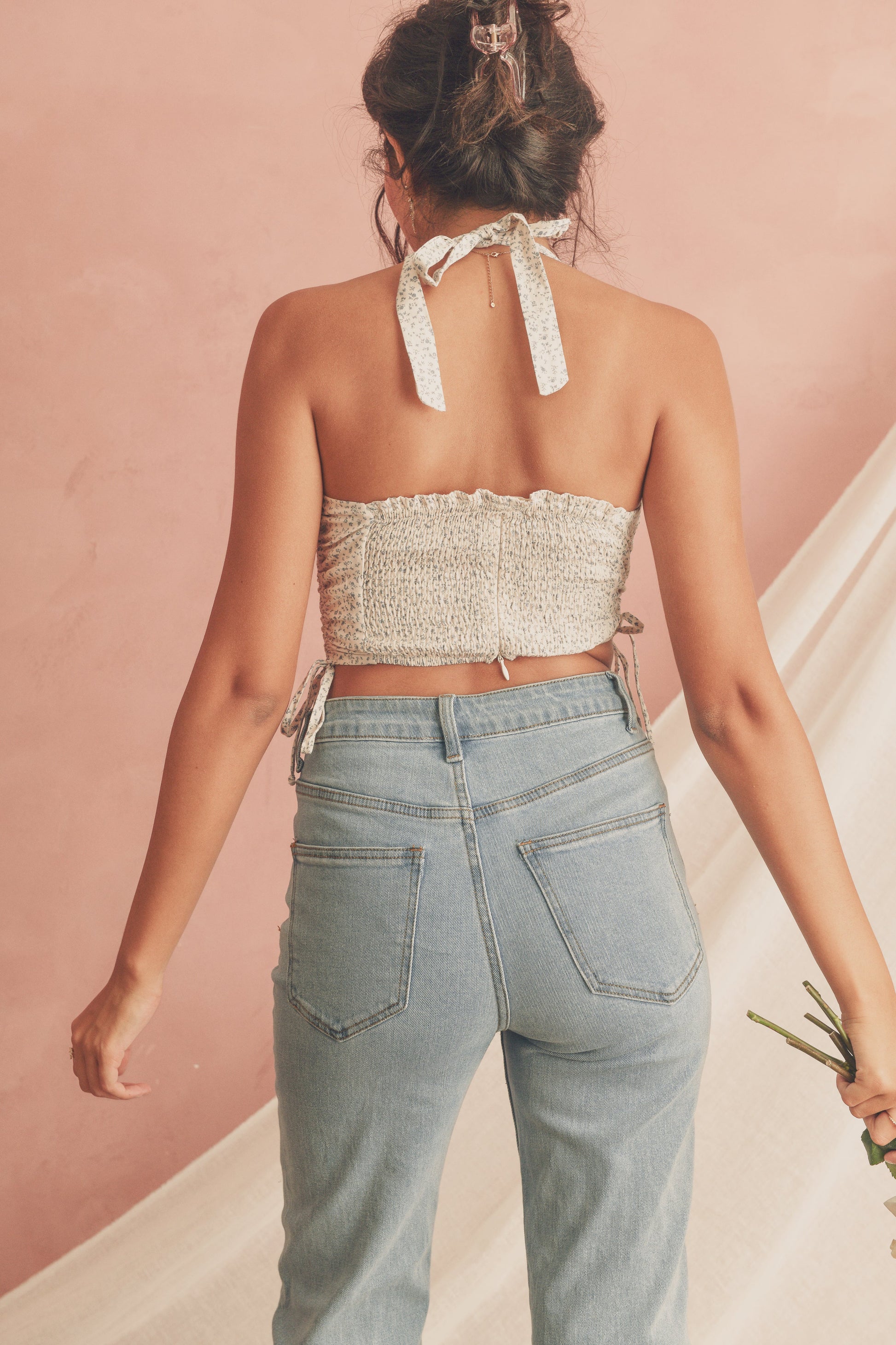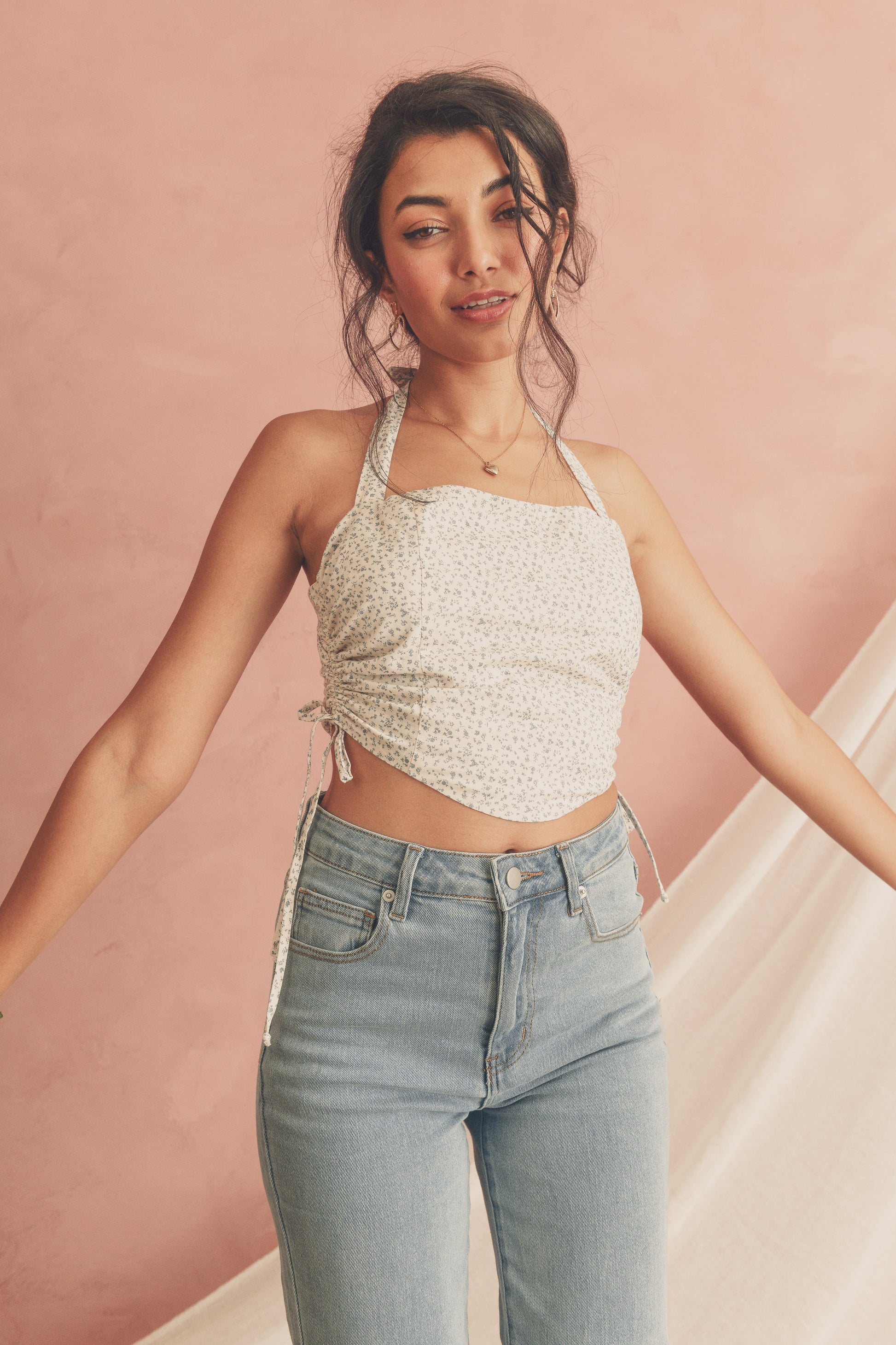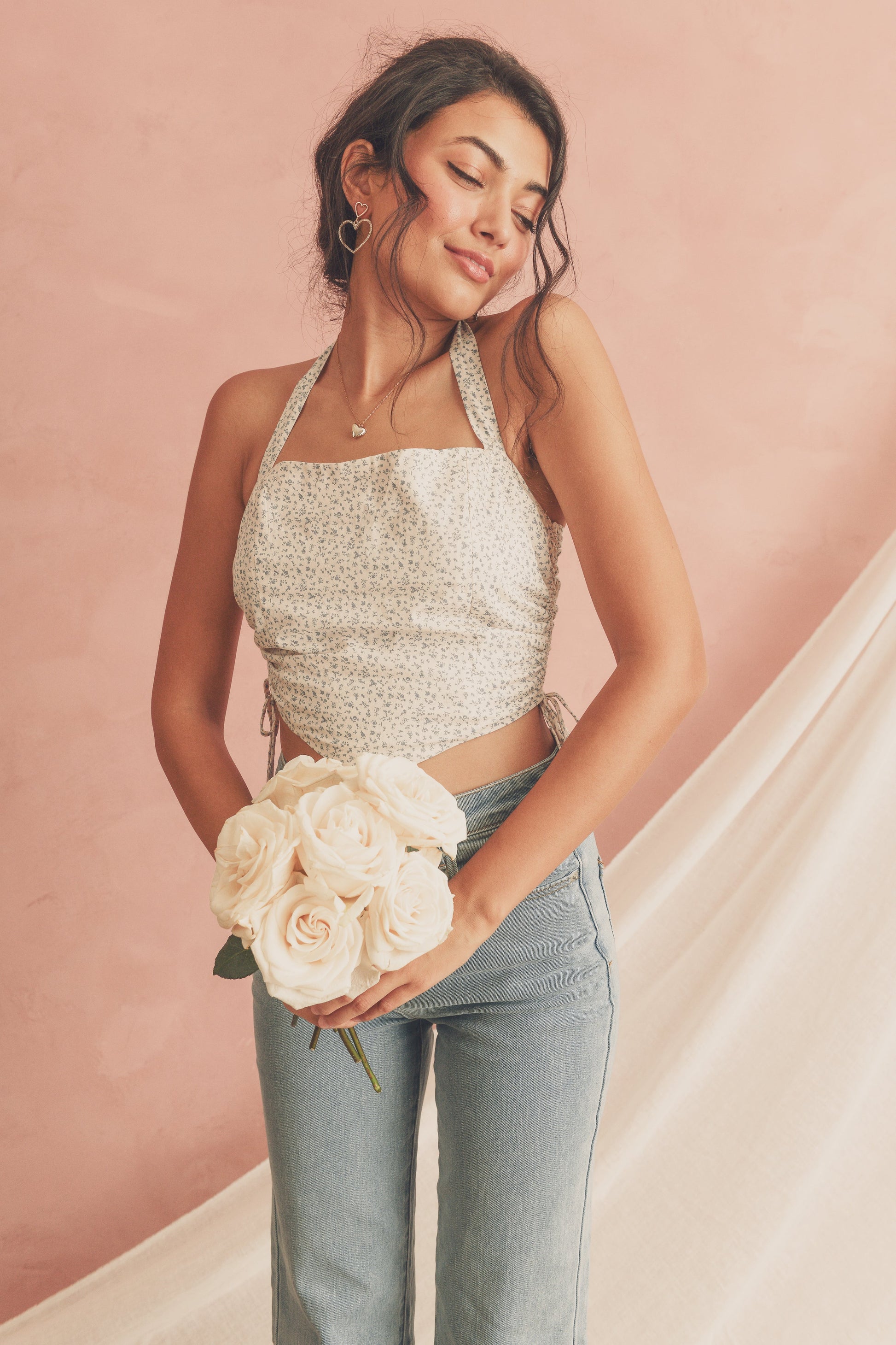 Blue floral halter top. Top features square neckline, side cinched adjustable ties, smocked back with hidden zipper.
