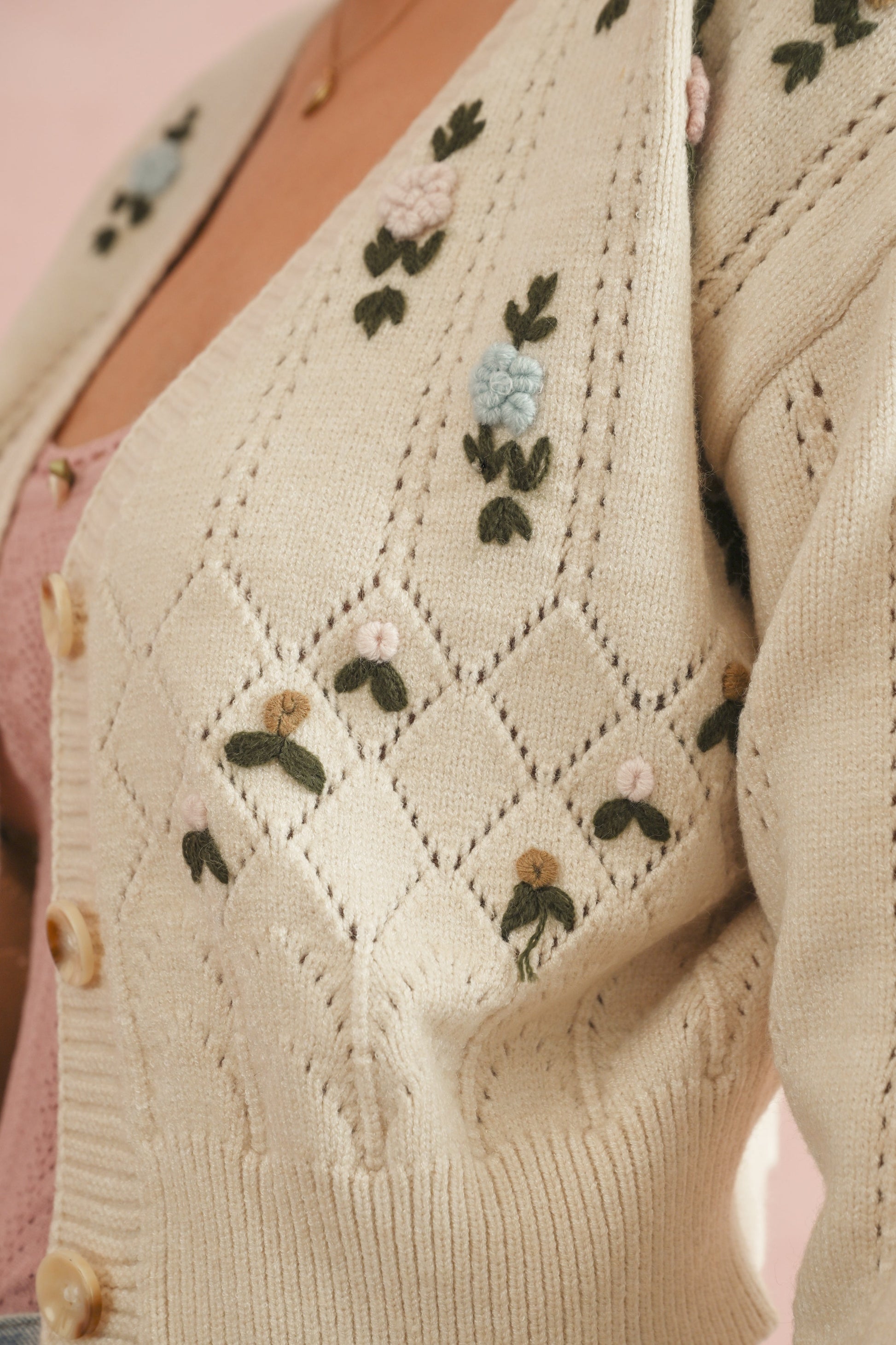 Cardigan features tortoise buttons, ribbed hemming, embroidery flowers, v-neckline, and pointelle design throughout.