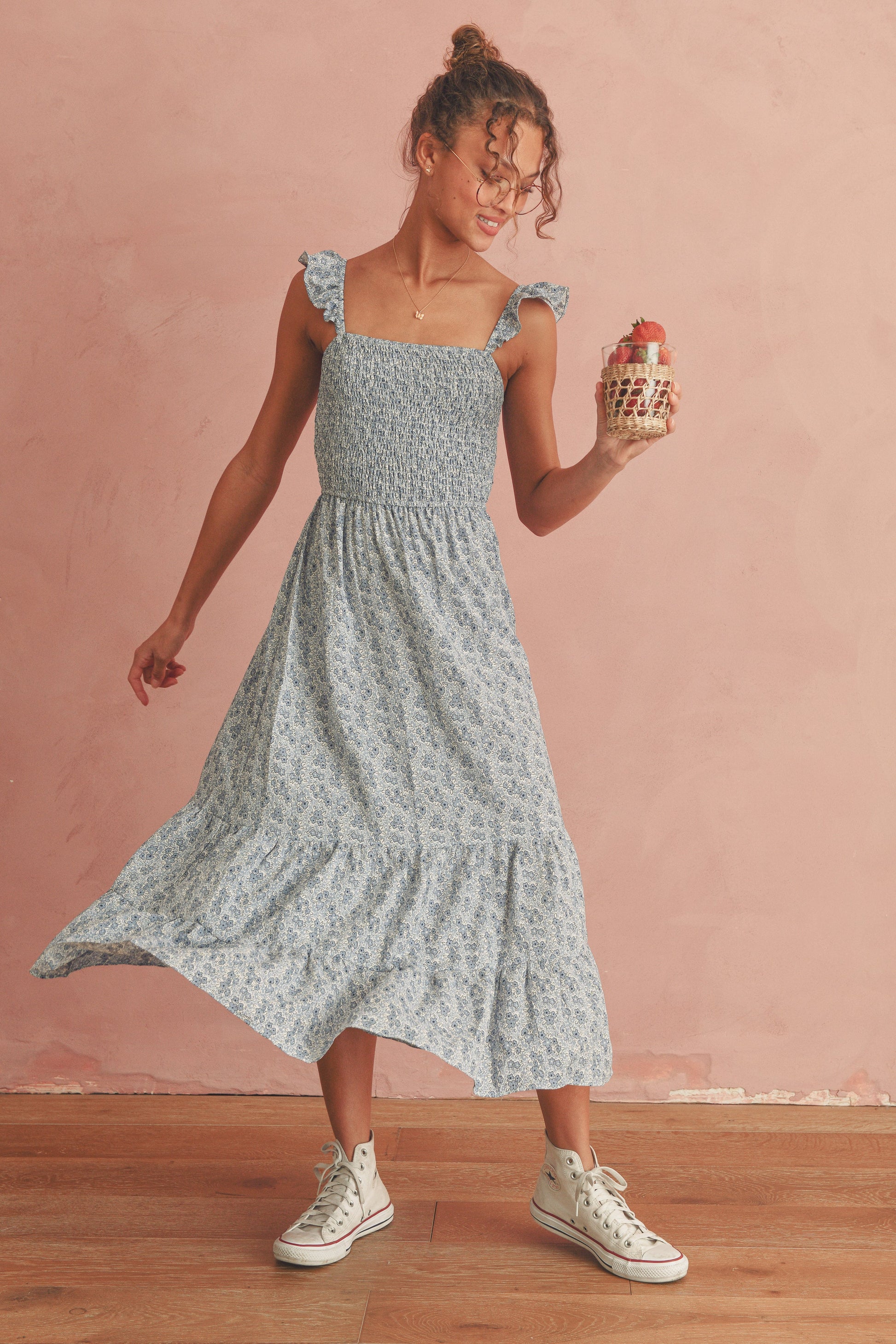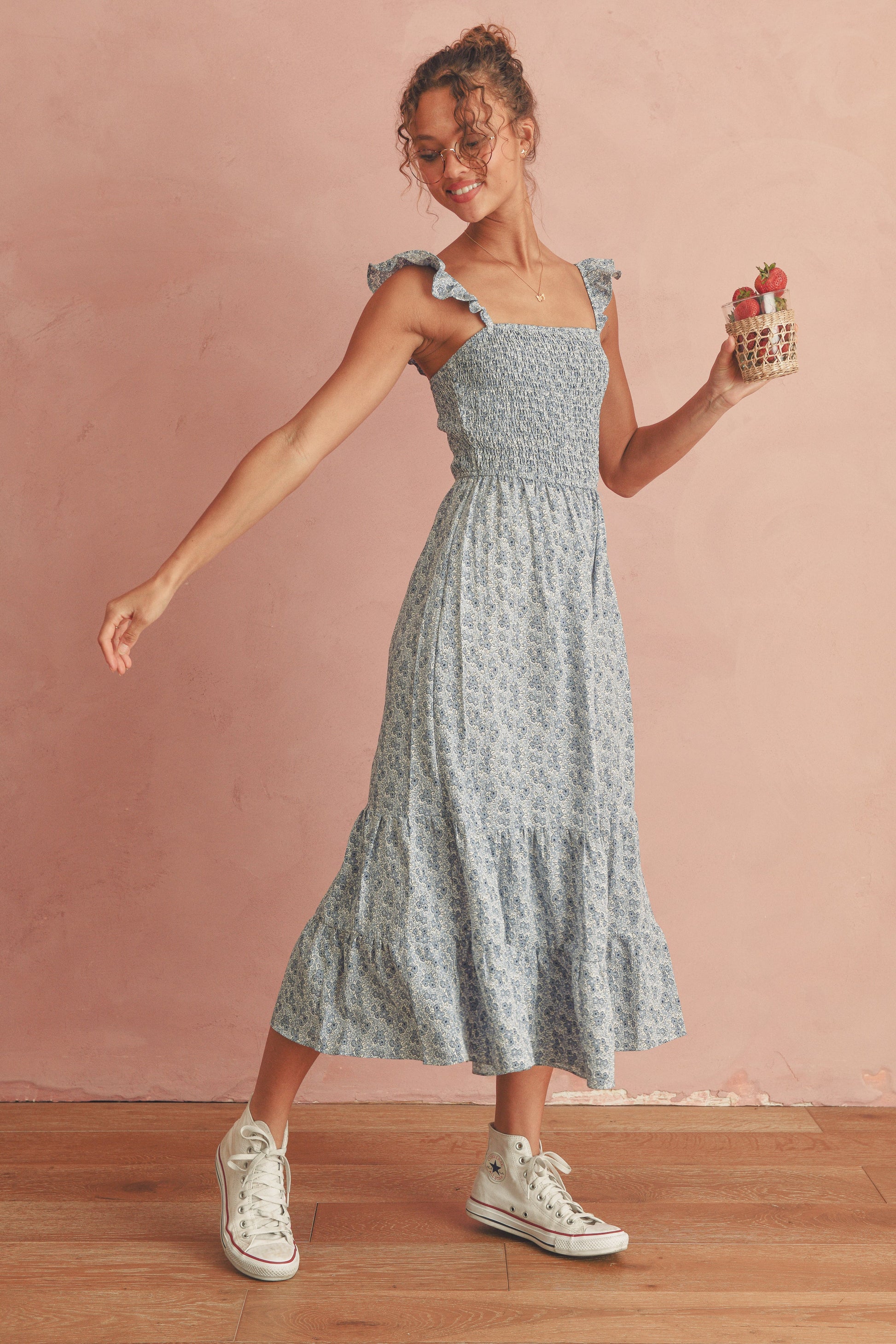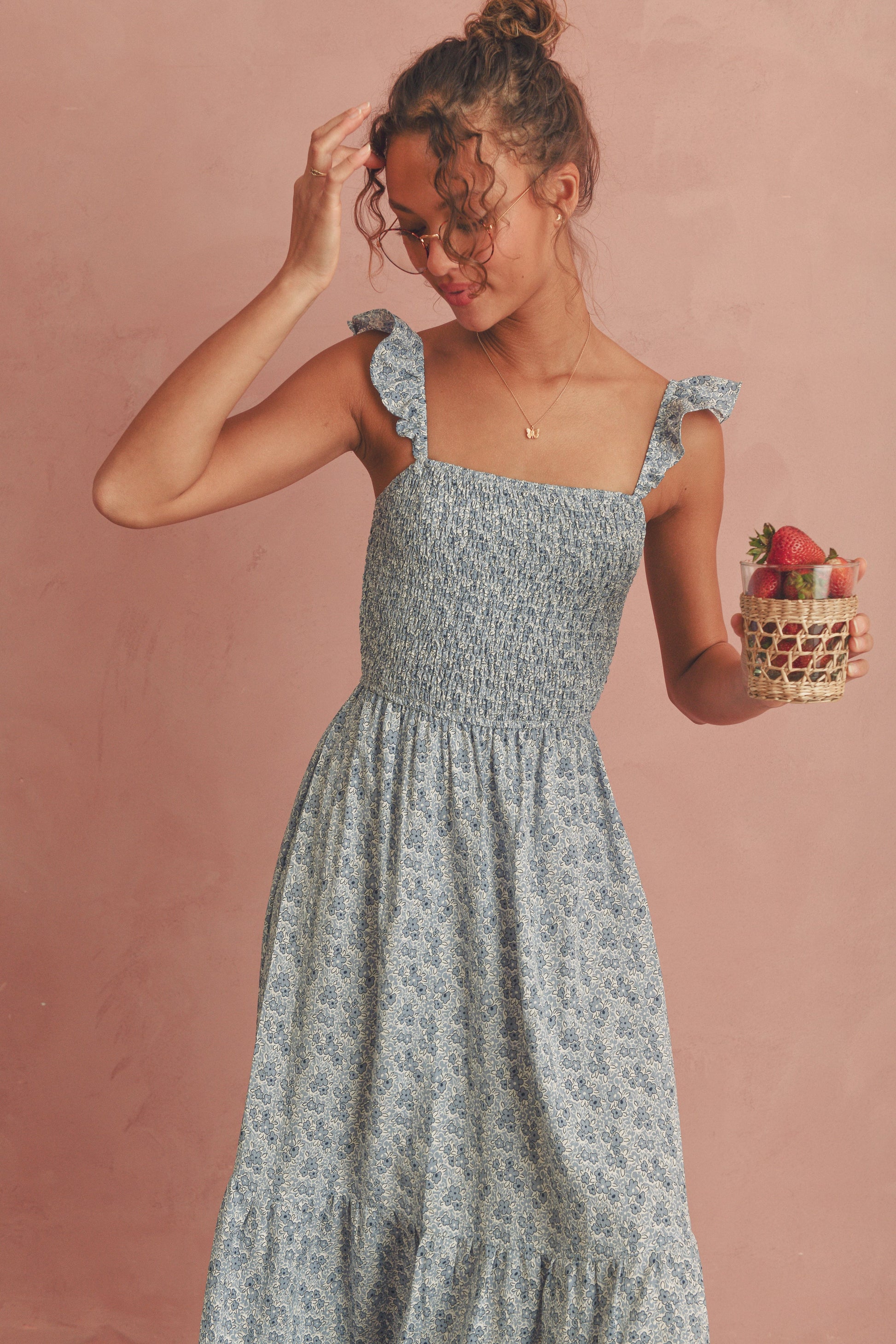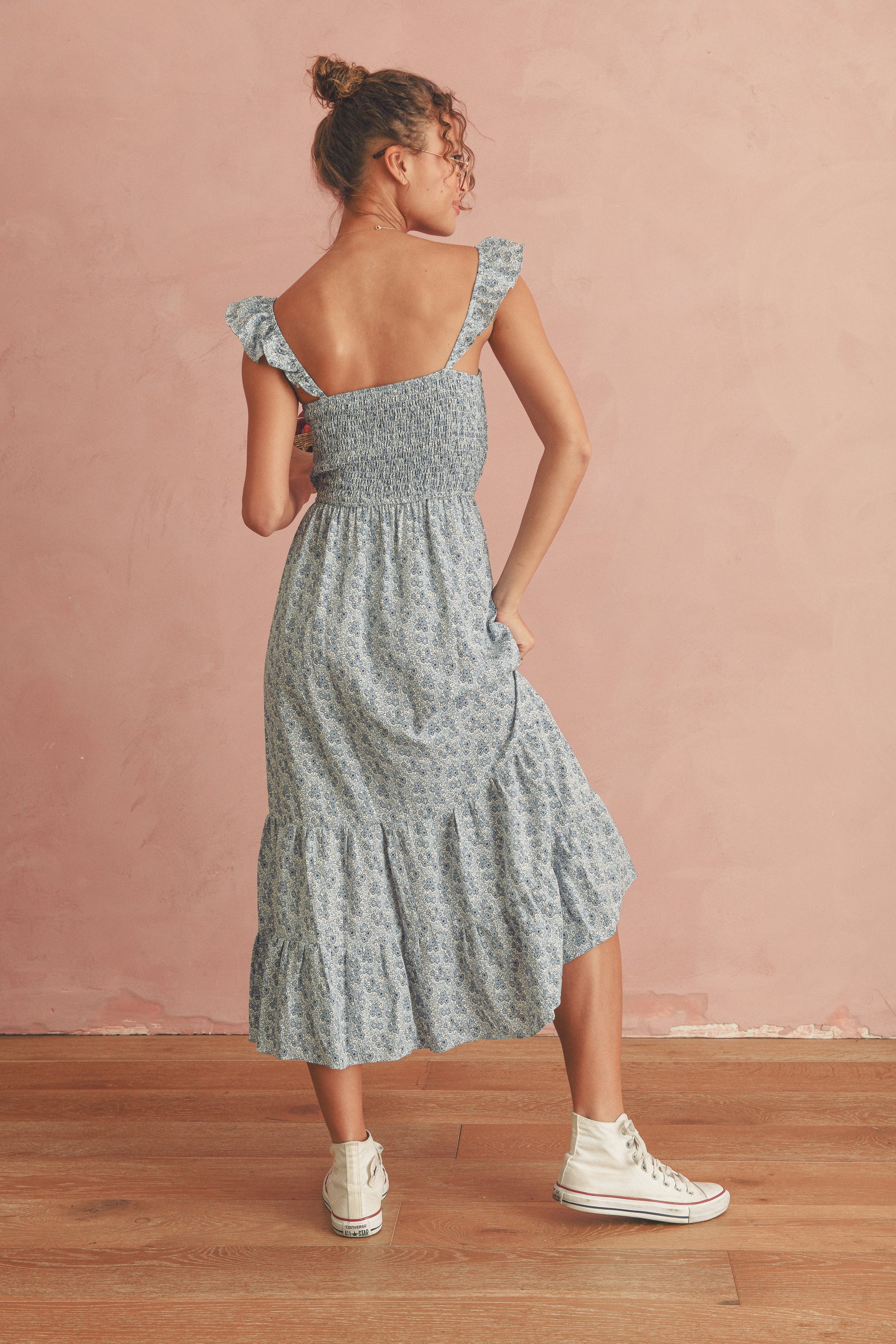 Midi length floral dress features square neckline, smocked bodice, ruffle straps, and tiered silhouette. Paired with our tiny butterfly studs, and flutter necklace.