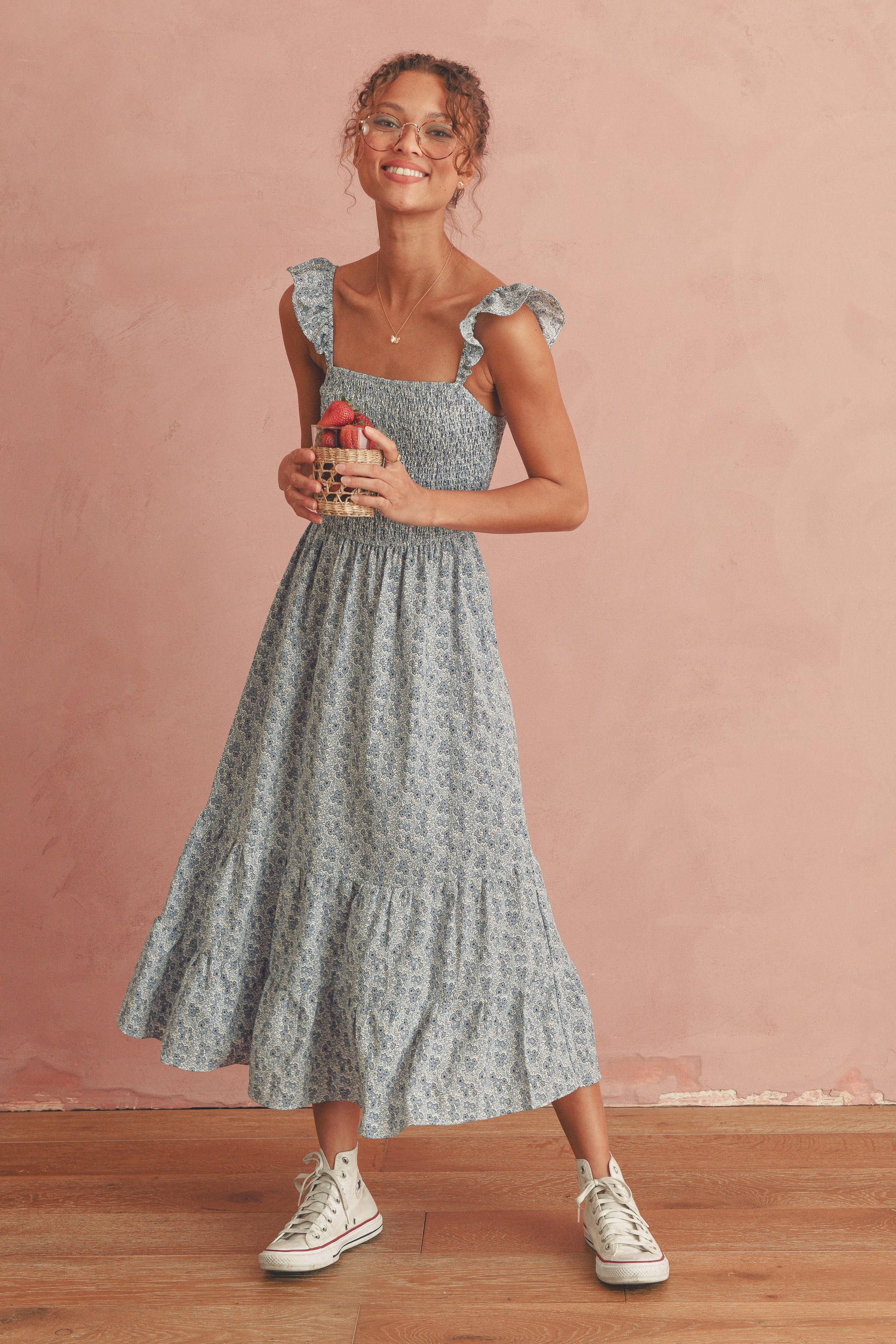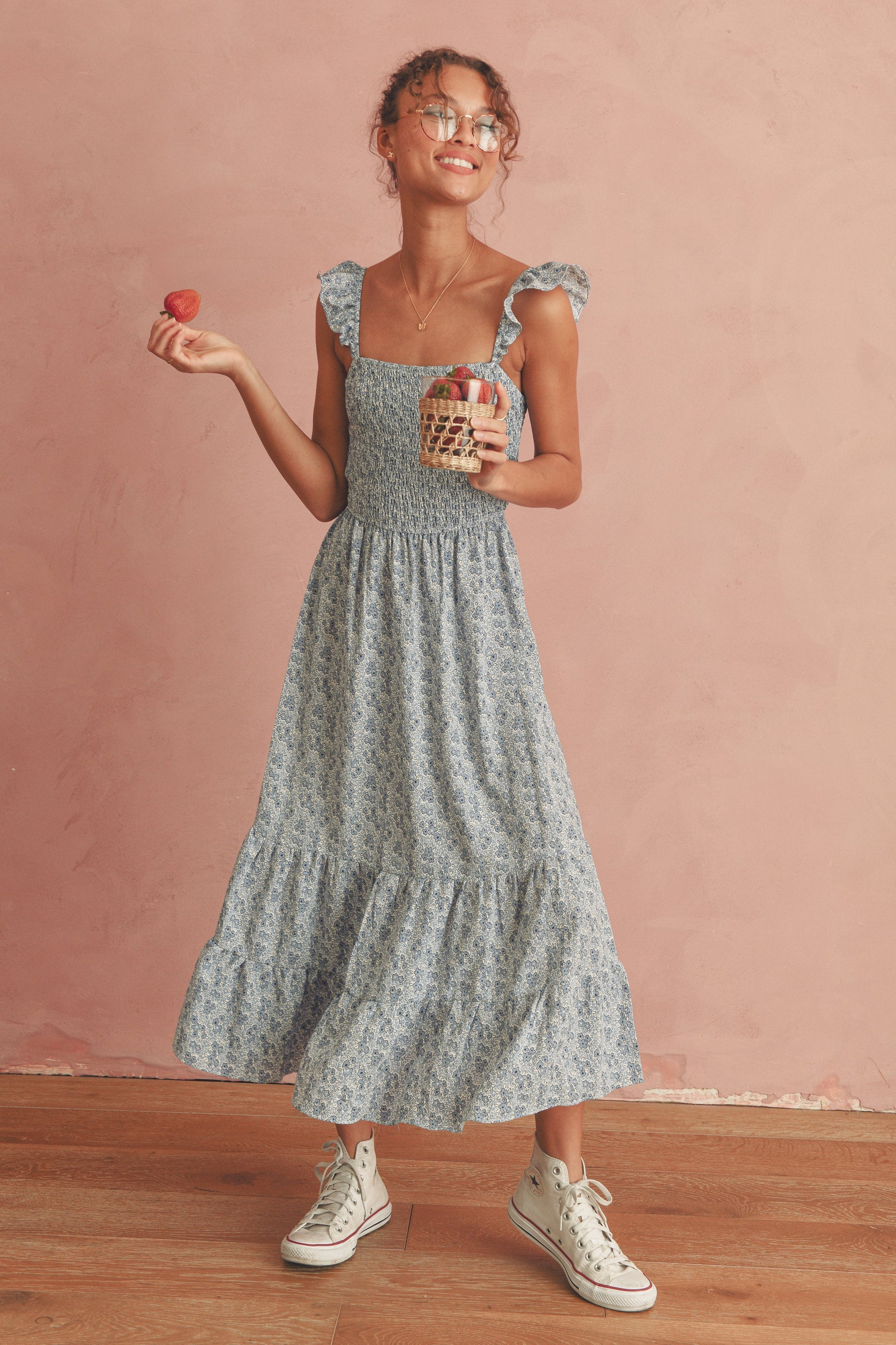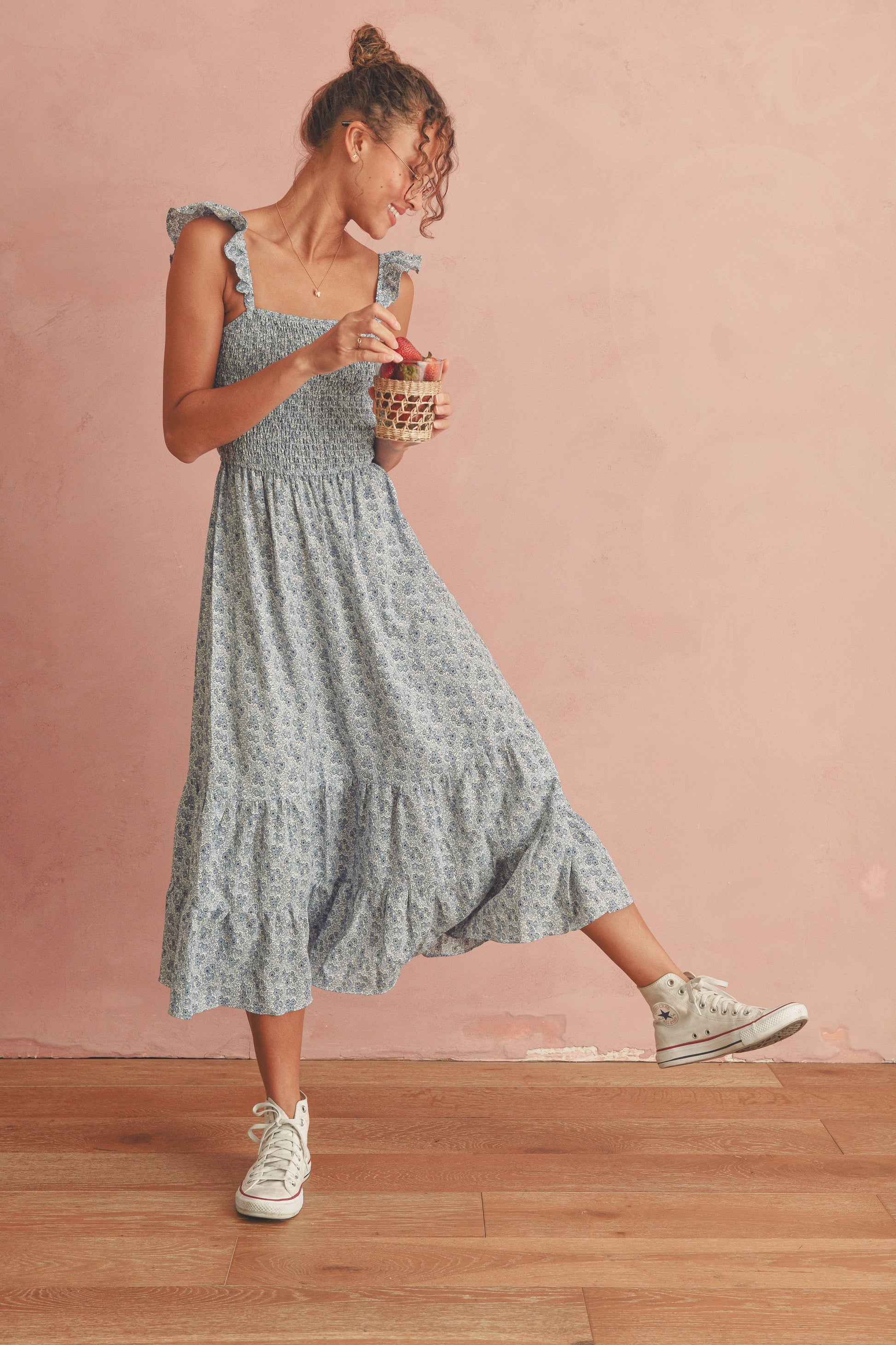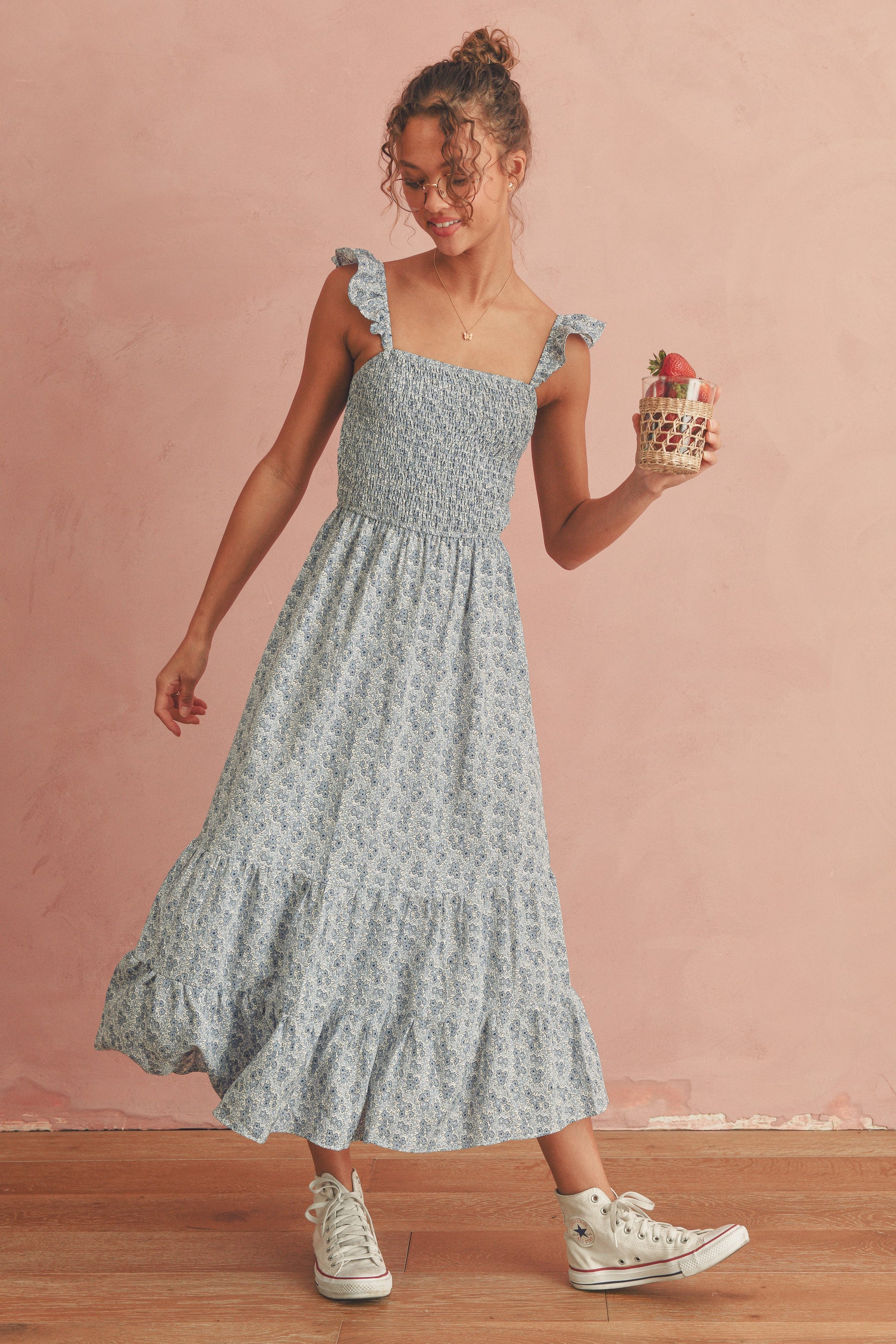 Midi length floral dress features square neckline, smocked bodice, ruffle straps, and tiered silhouette. Paired with our tiny butterfly studs, and flutter necklace.