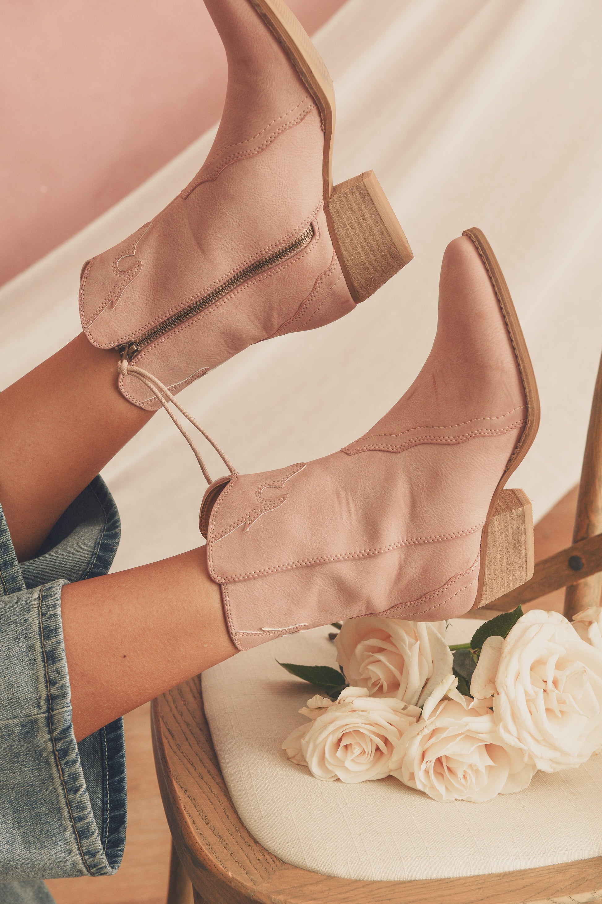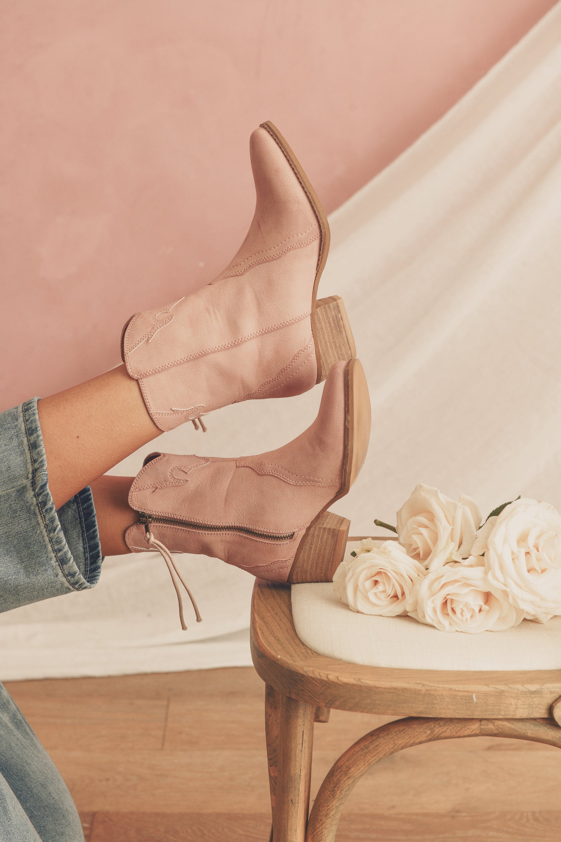 Western inspired pointed toe shot features side zipper with fringe detail. Paired with night singing birds dress. Paired with