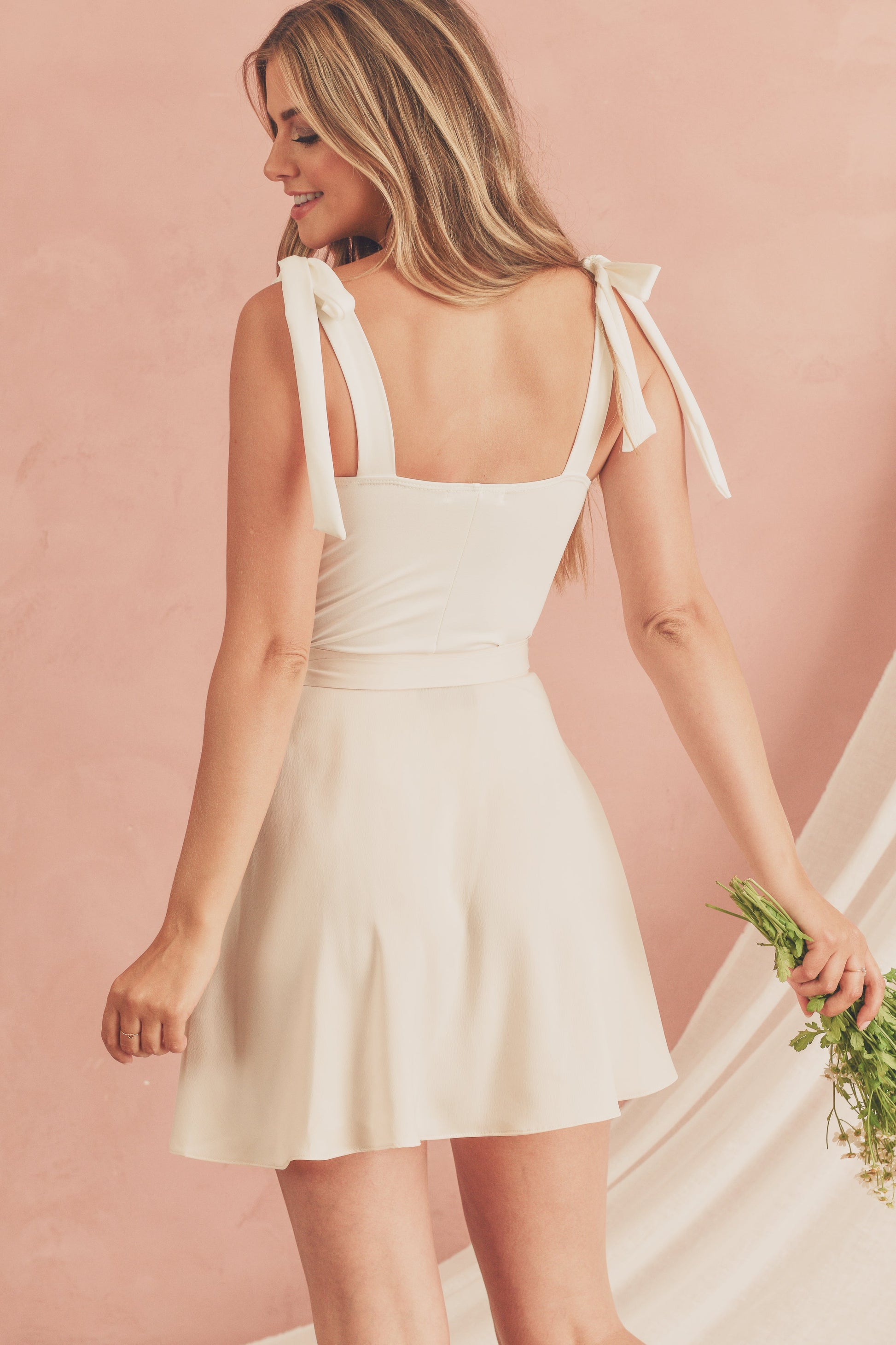 Bodysuit features self tie straps, wired bust detailing, ruching at bust, and snap on/off bottom bodysuit feature. Paired with our watercolor daisy necklace, rosewood ring, infinite love ring, and house covered in ivy skirt.