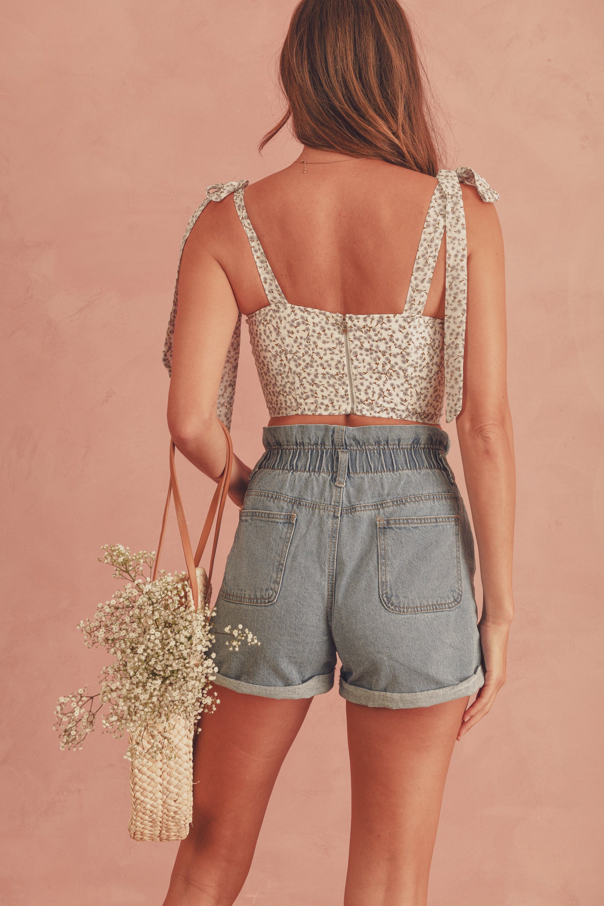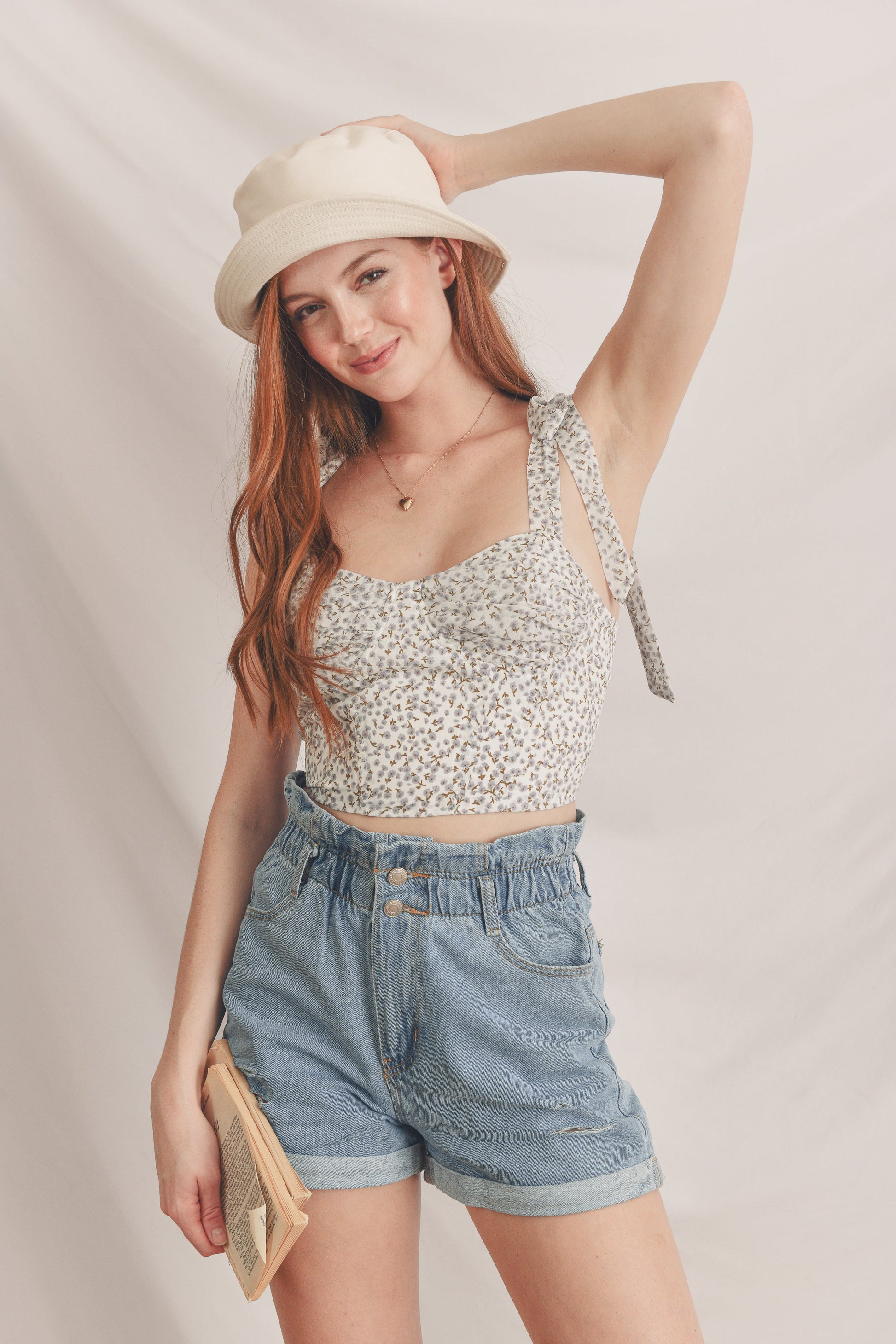 Cropped floral top features lilac floral print, sweetheart neckline, hidden back zipper, fully lined, and adjustable tie straps. Paired with our golden heart locket necklace, flutter ring, pocket full of daisies shorts ,happy little tune bag, tiny butterfly studs and summer bike rides hat.